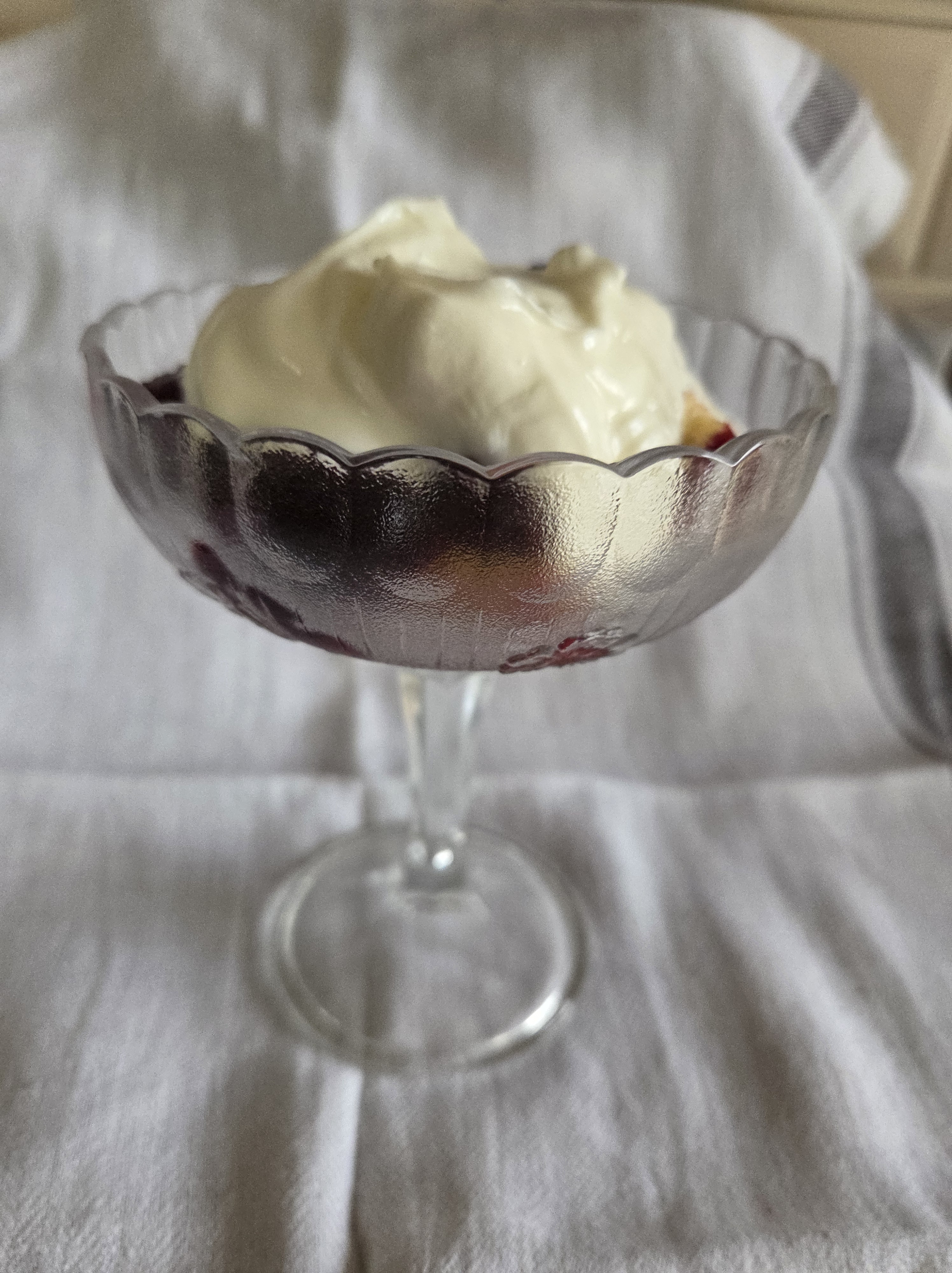 - I made a mixture of frozen sweet cherries, lemon juice and some soured cherry jam, heated in a small pan with a little potato flour to thicken the mix.