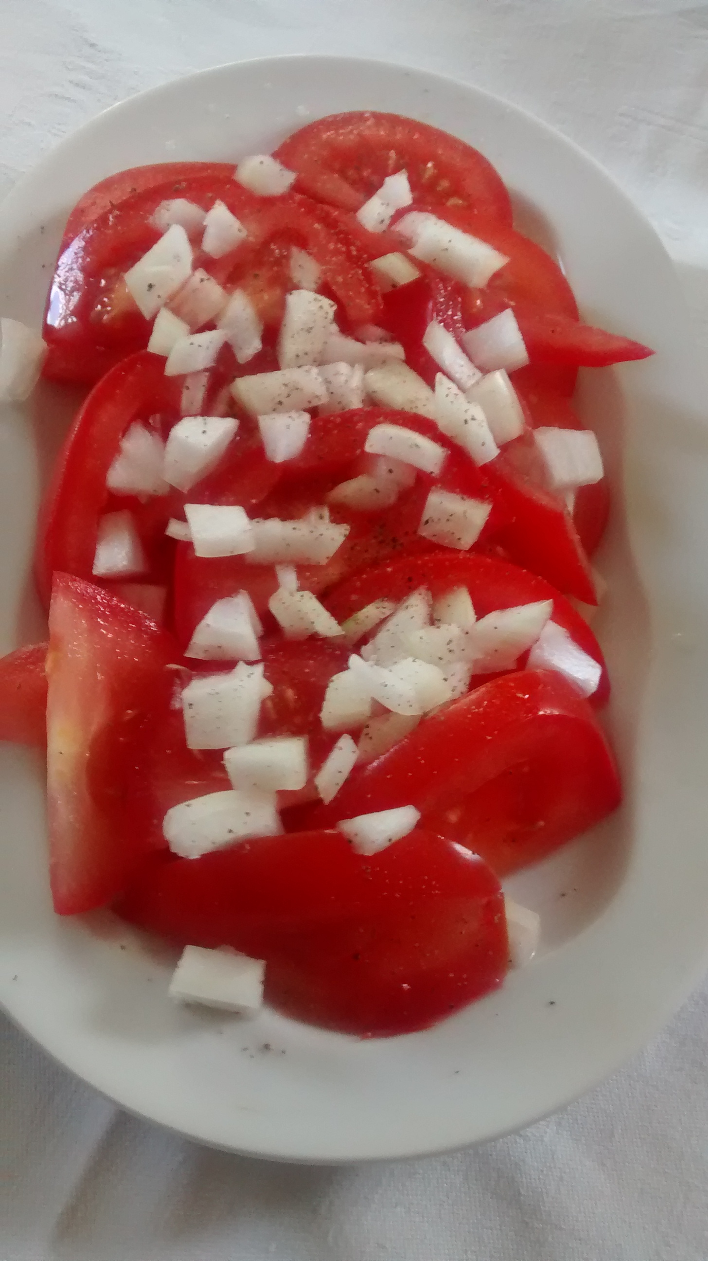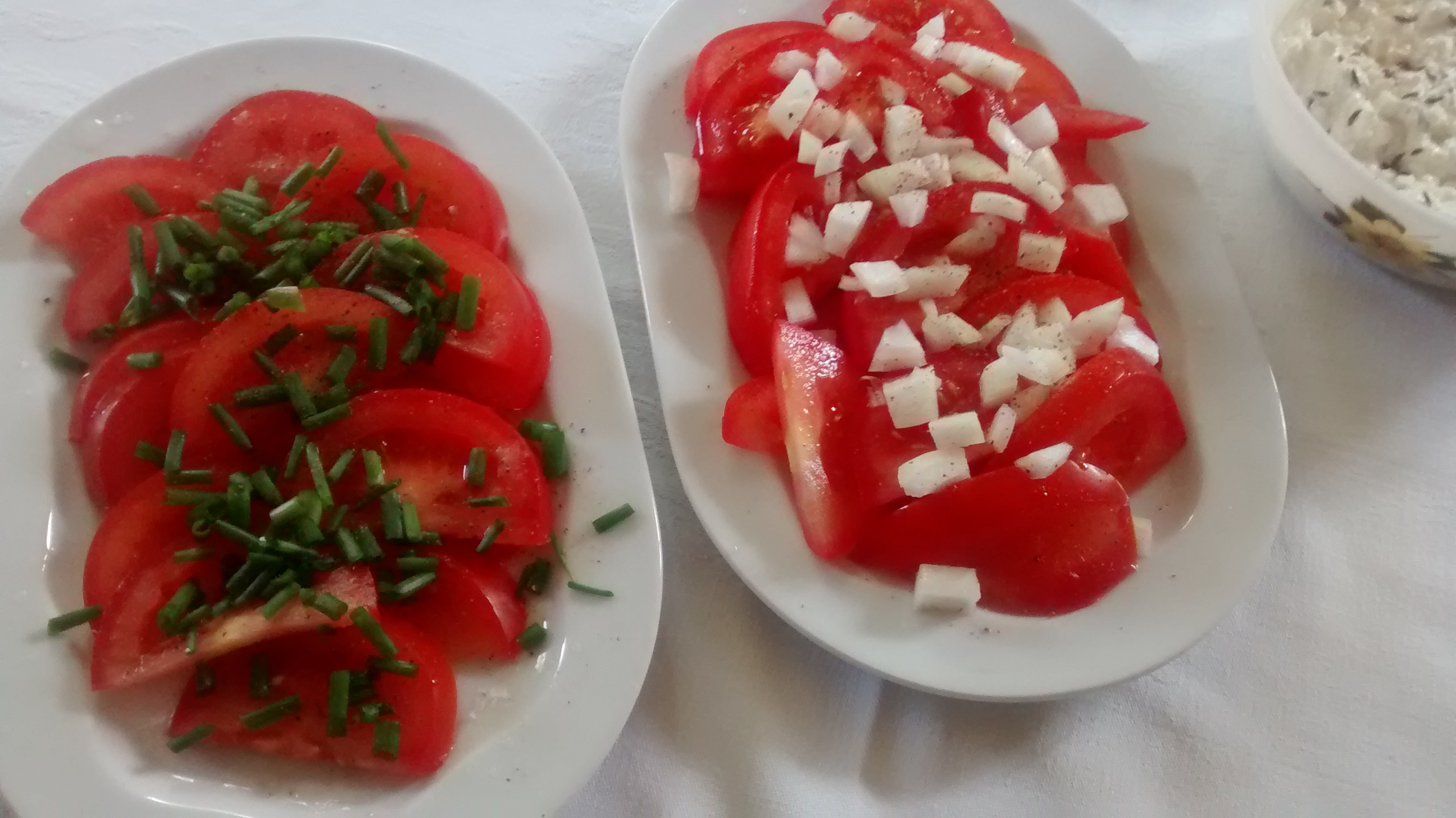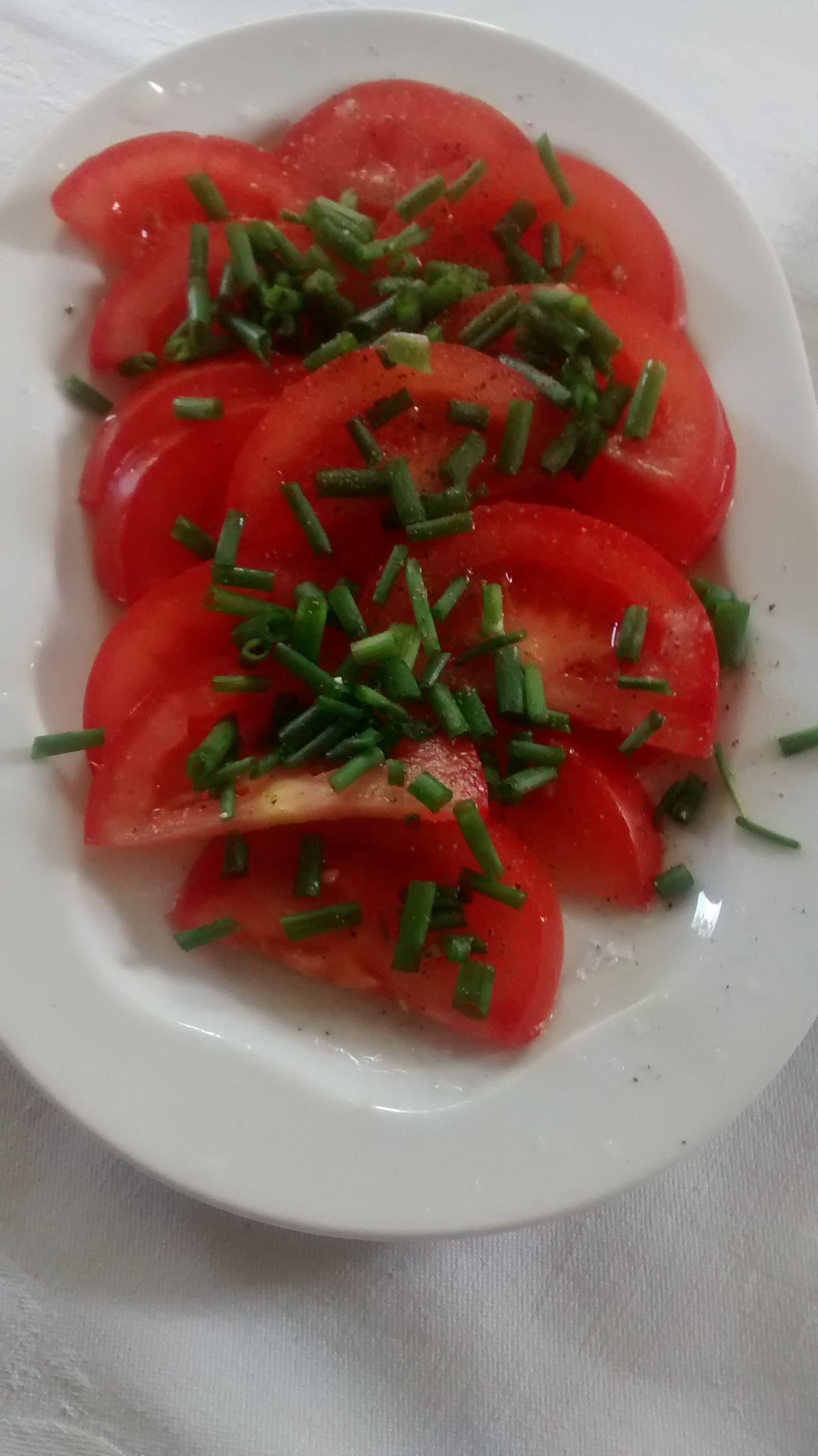 A simple tomato salad is served in Poland, always it seemed to me with the addition of onions, chives or the green part of spring onion. For many it is standard fare for breakfast with cold meats or Polish curd cheese.