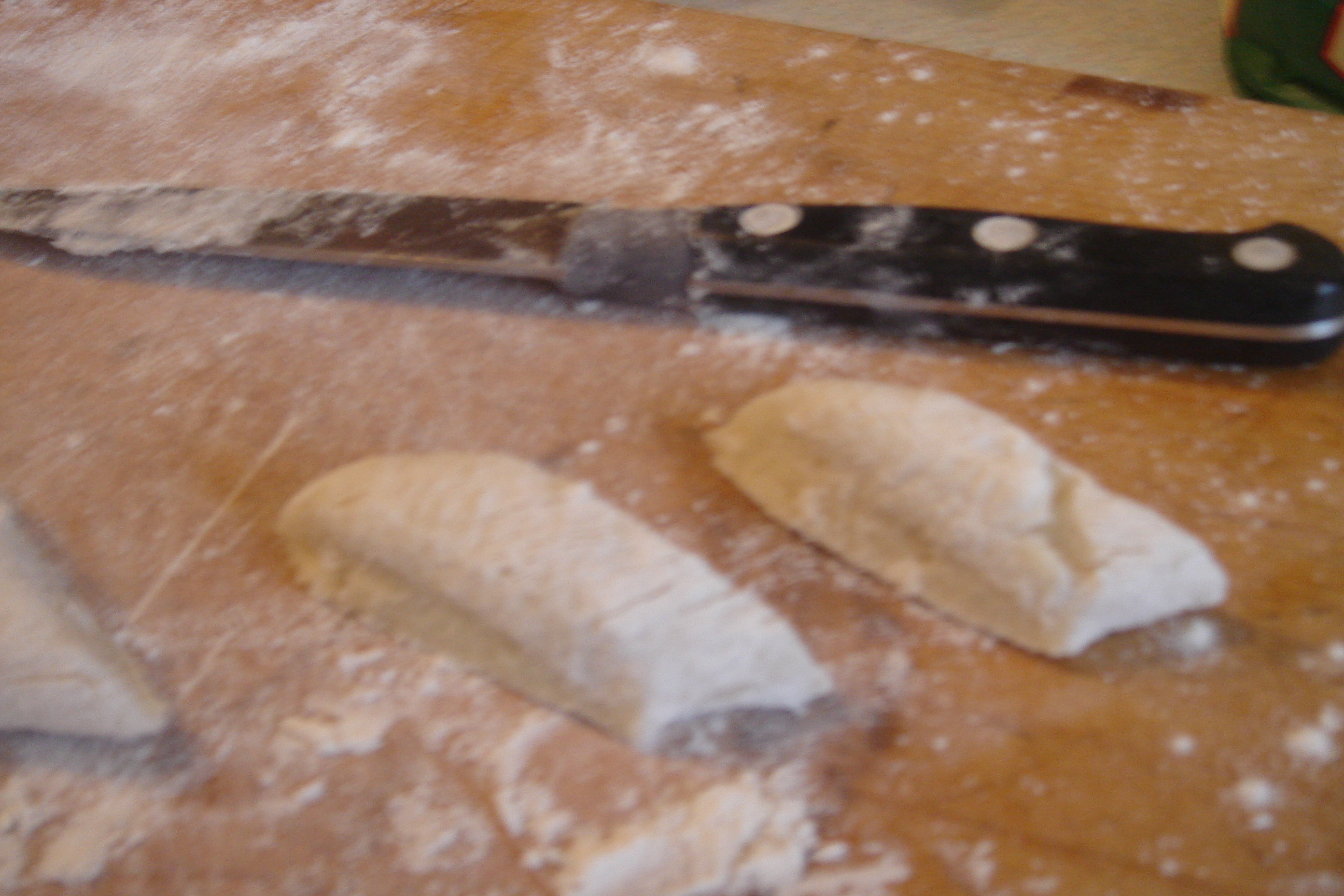 Use a sharp knife to cut the dough into pieces, make the first cut at a diagonal and make the thickness about 1 to 1.5cm. You will get a sort of oval shape.