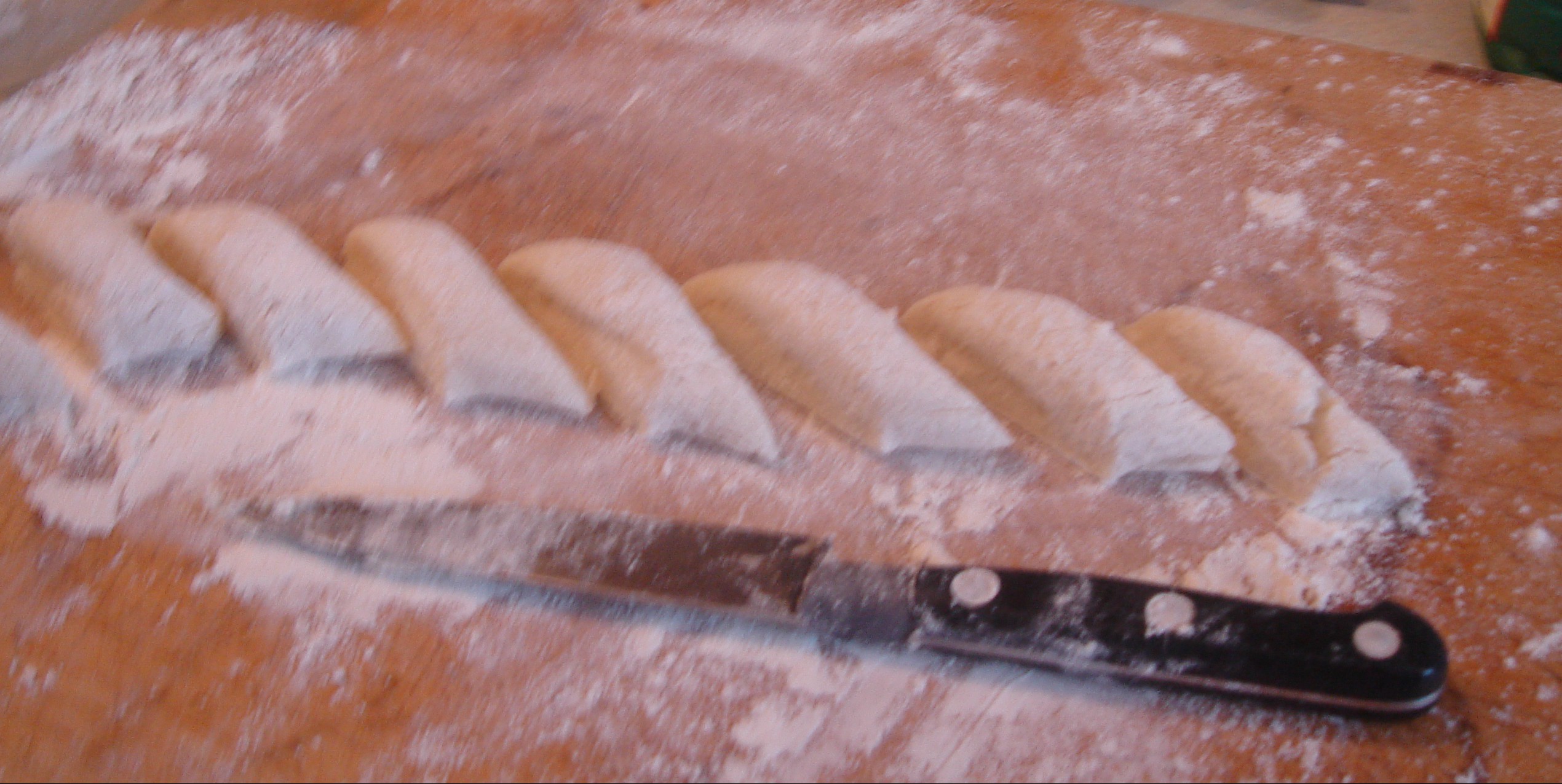 Divide the dough into quarters and using a floured board shape the dough and roll it with you hands until you have a long sausage about 3cm in diameter. If the dough sticks to the board then you need to add more flour.