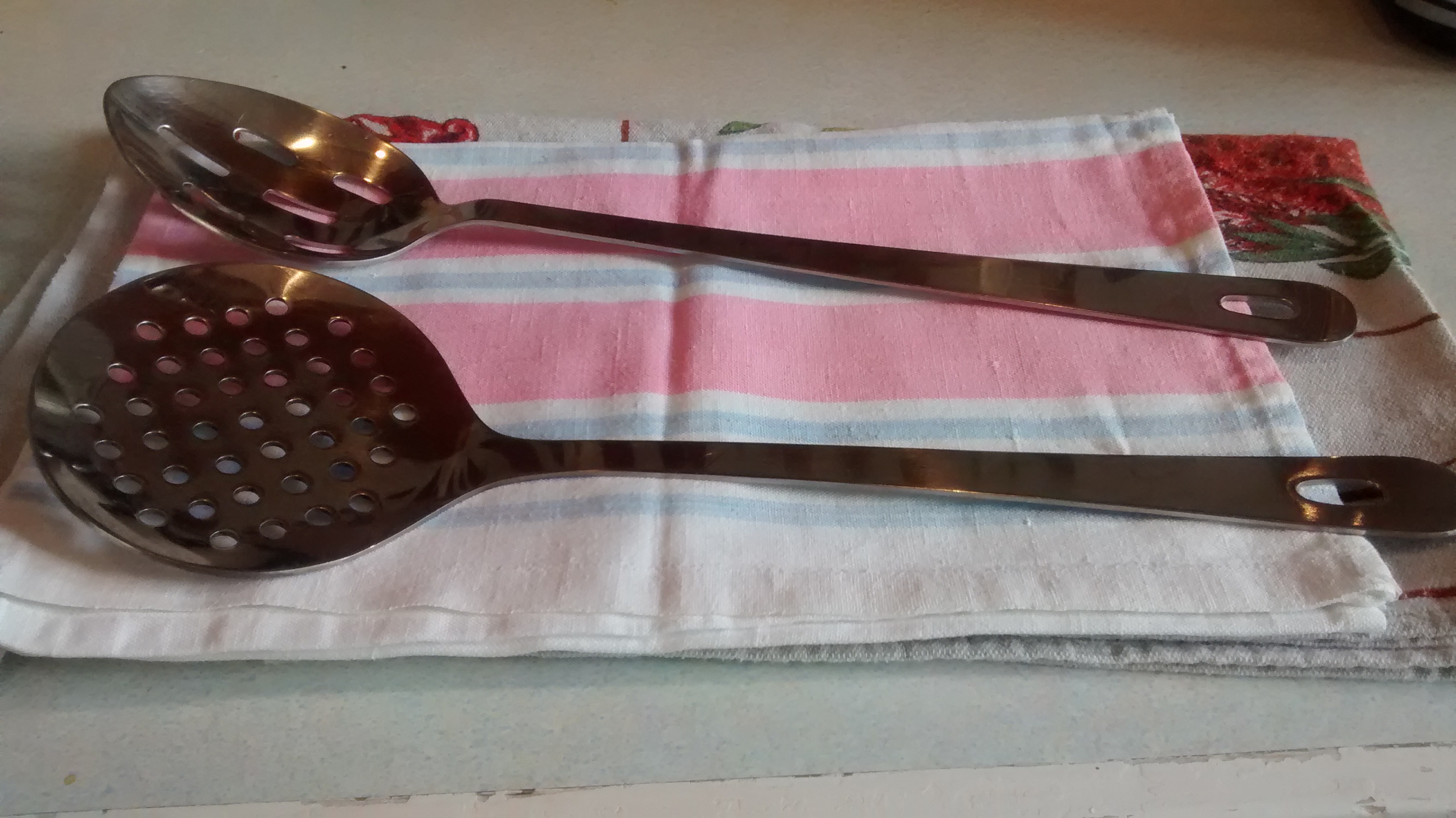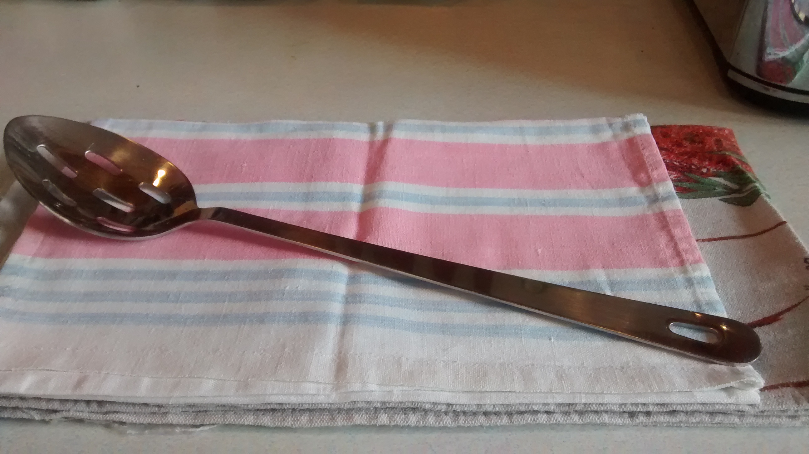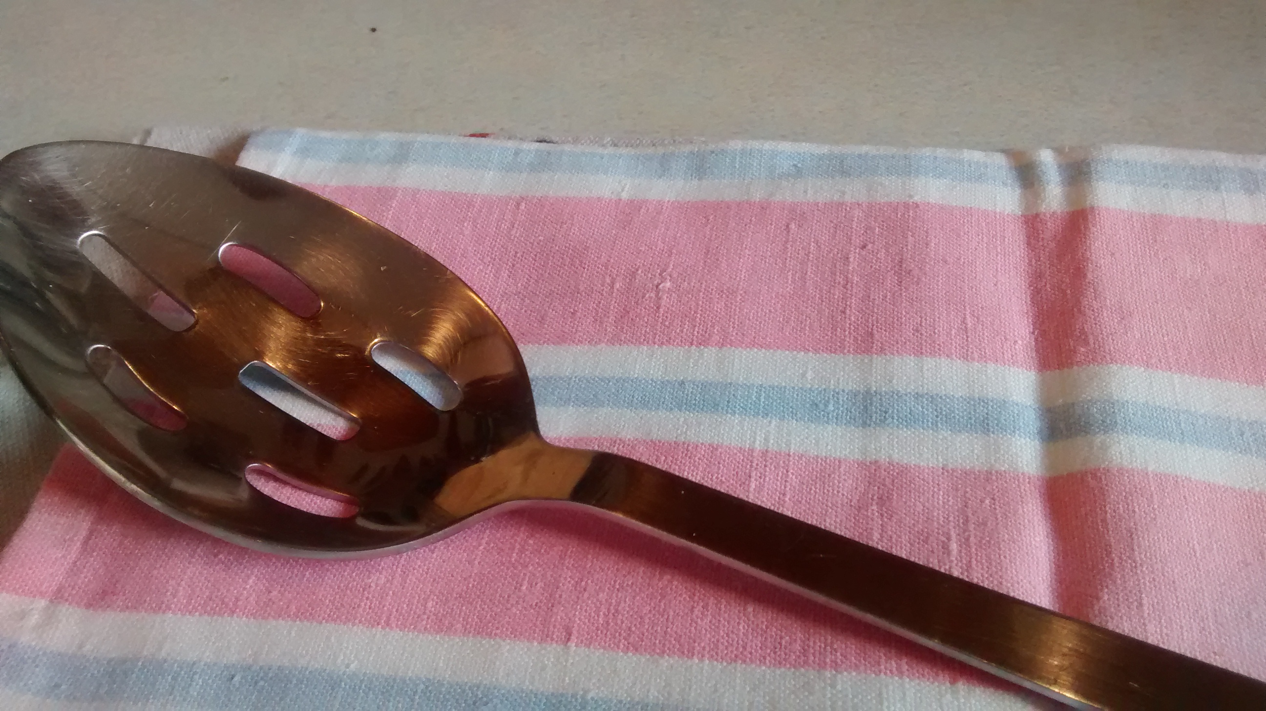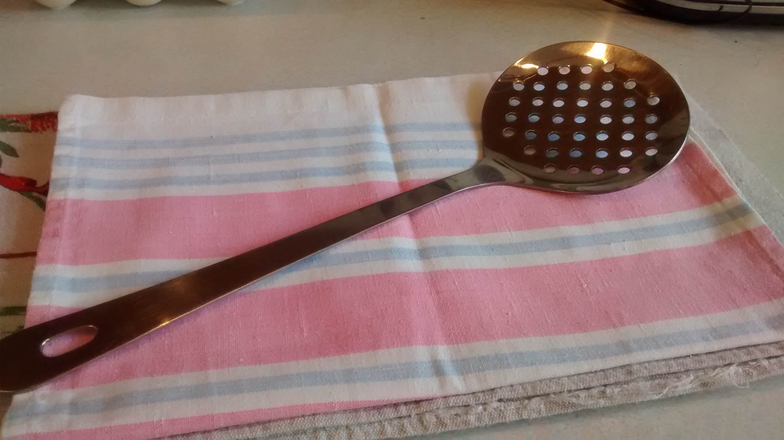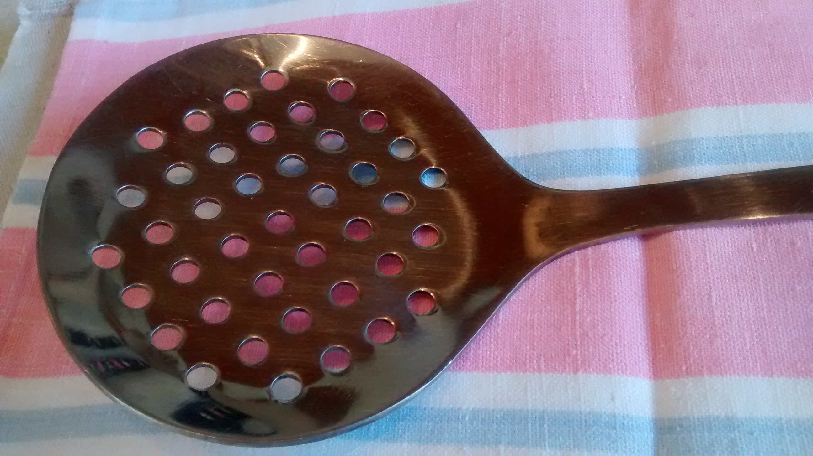 As they cook they will float to the surface, give them about another minute and then remove them with a slotted or a perforated spoon and put them in a colander. I have a colander sitting in an empty pan by the side of the large pan in which I am boiling the dumplings.