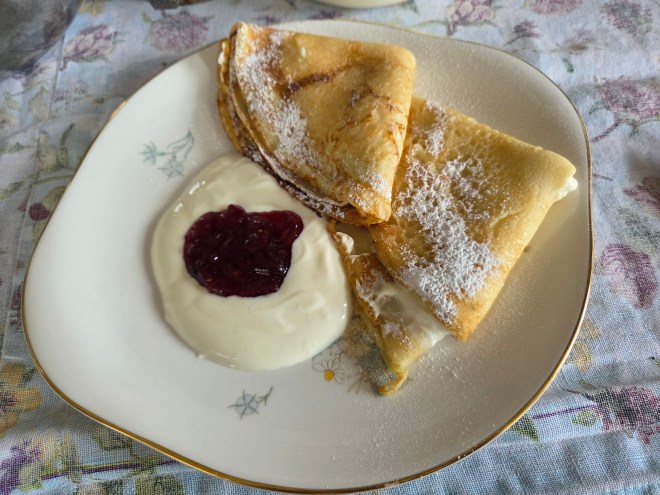 - I used sweet twarȯg(or well drained yoghurt cheese) for the filling and served it with yoghurt sweetened with icing sugar and
