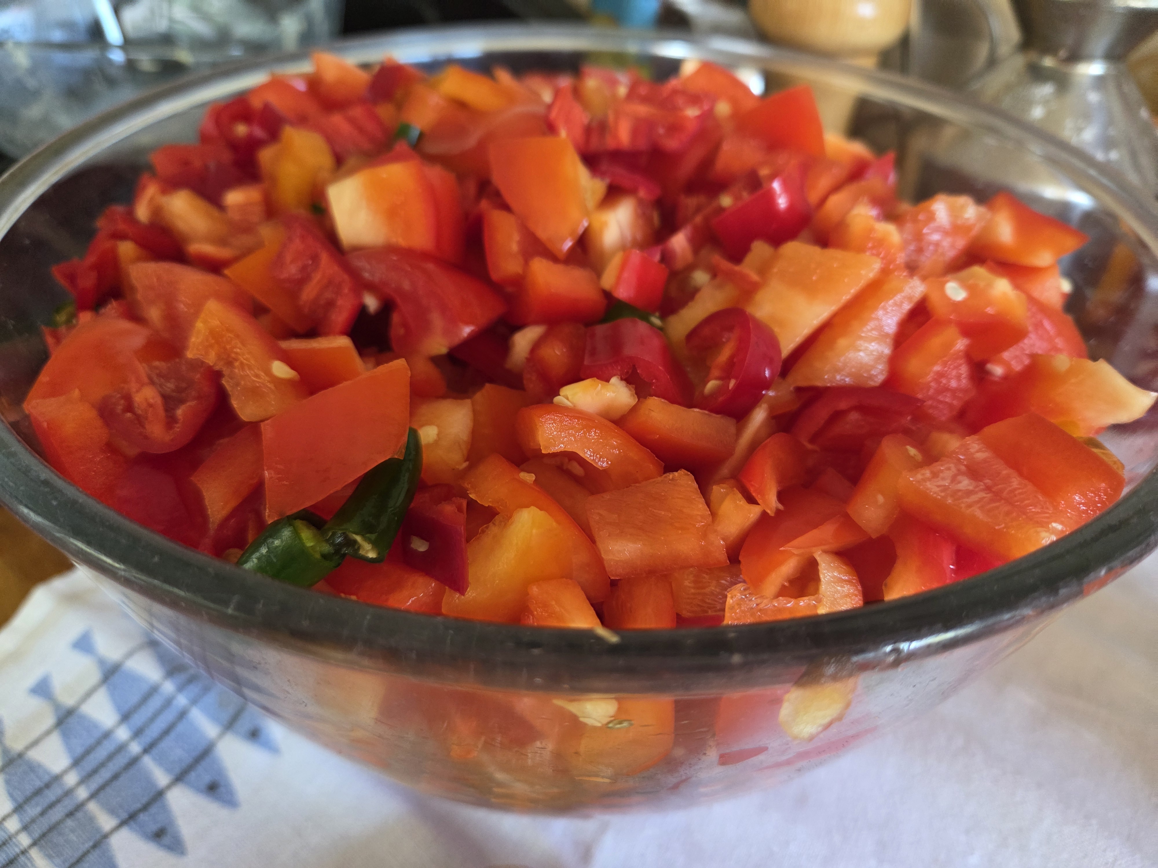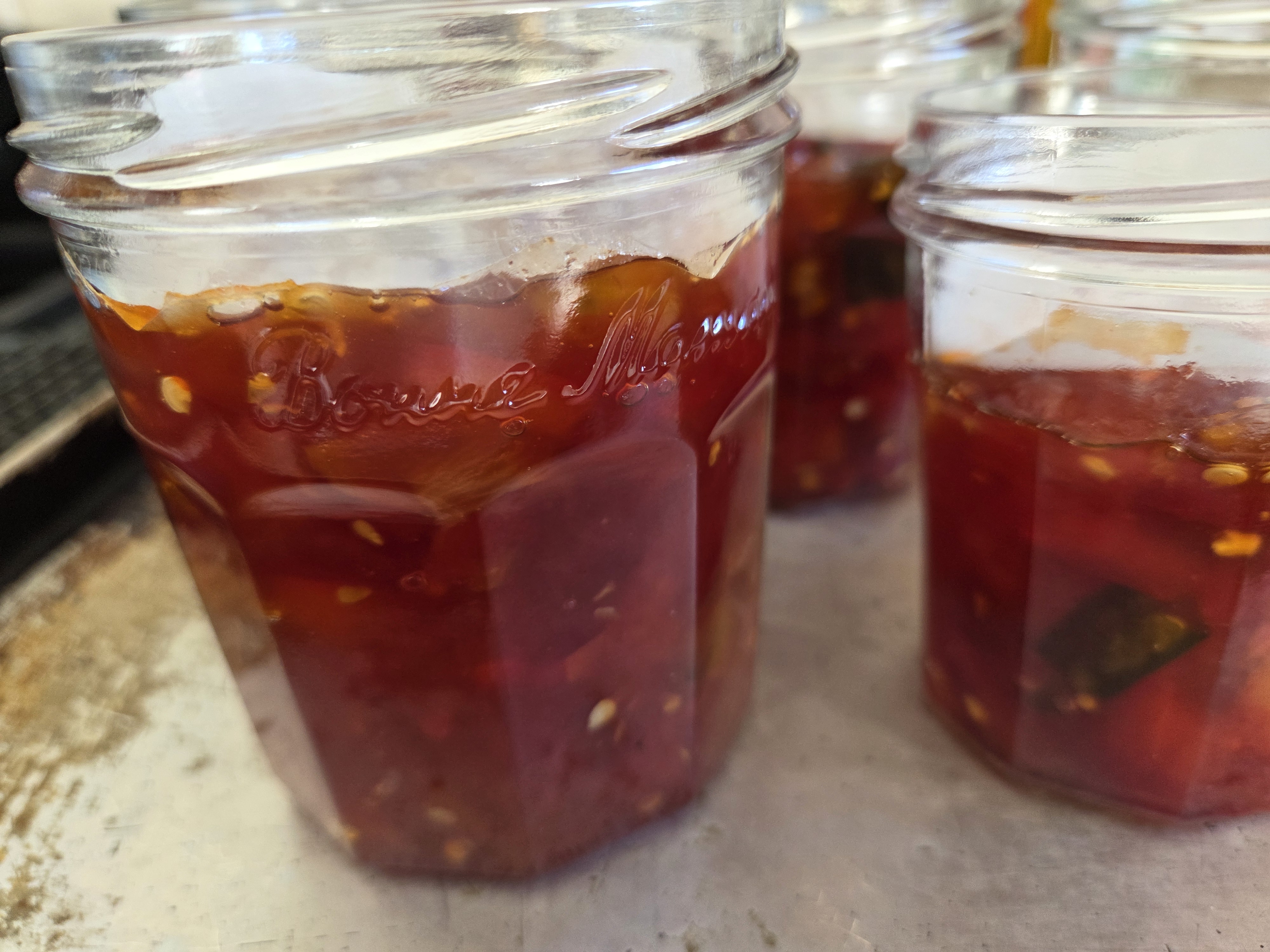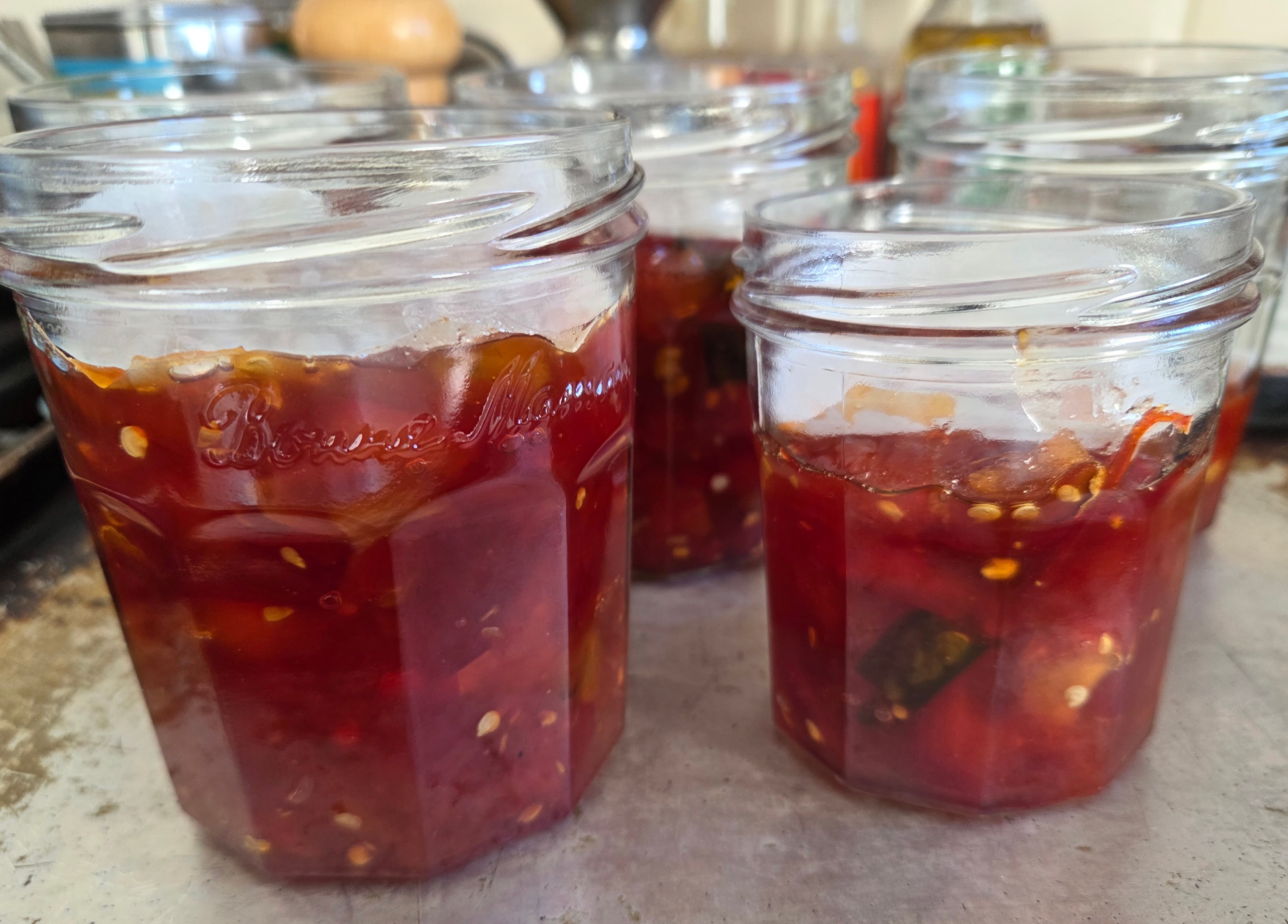 - You might need a knife laid down to help keep the peppers vertical.