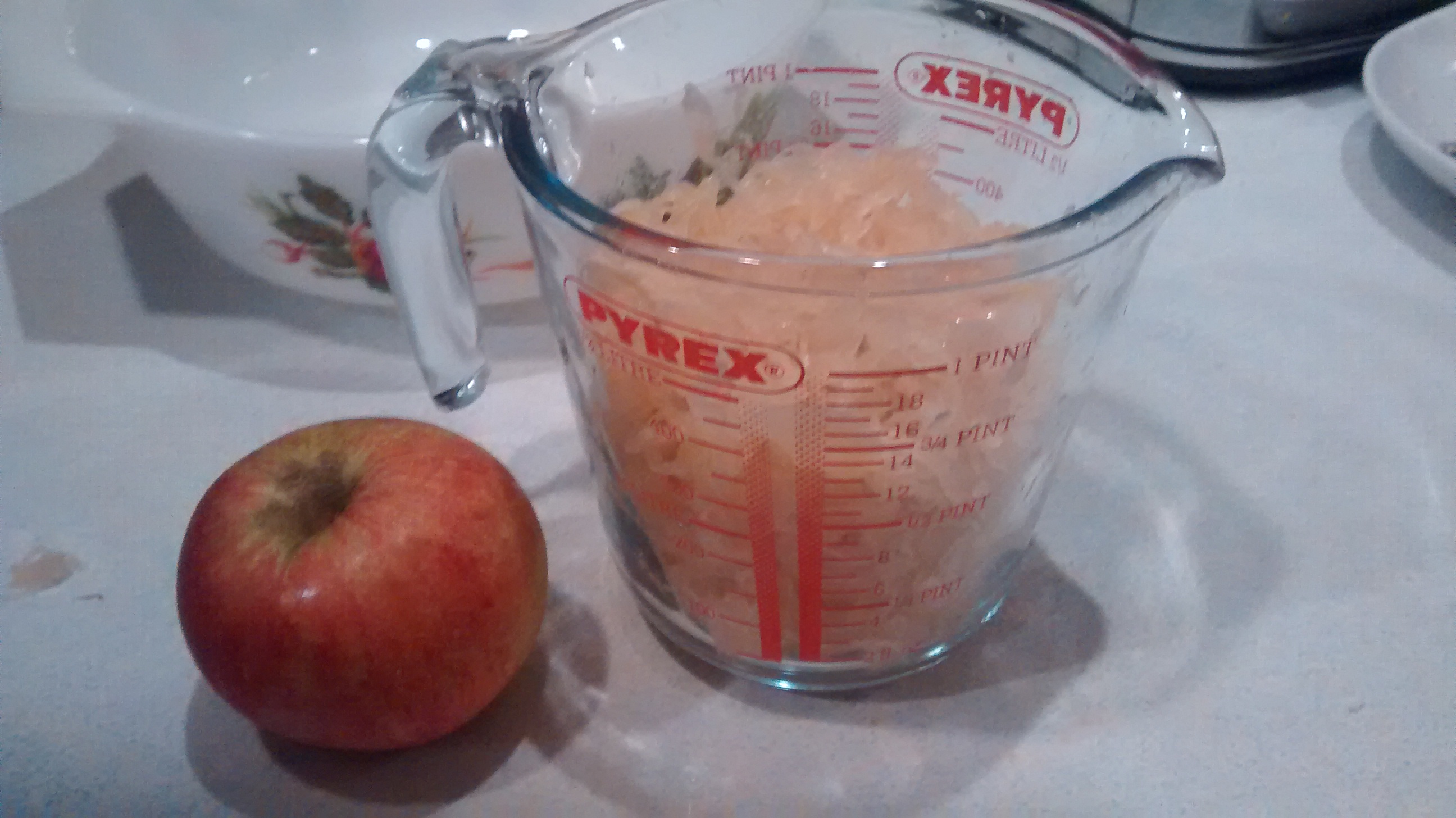 Grate the apple, skin and flesh using a coarse grater and add this to the sauerkraut. Mix the two together.