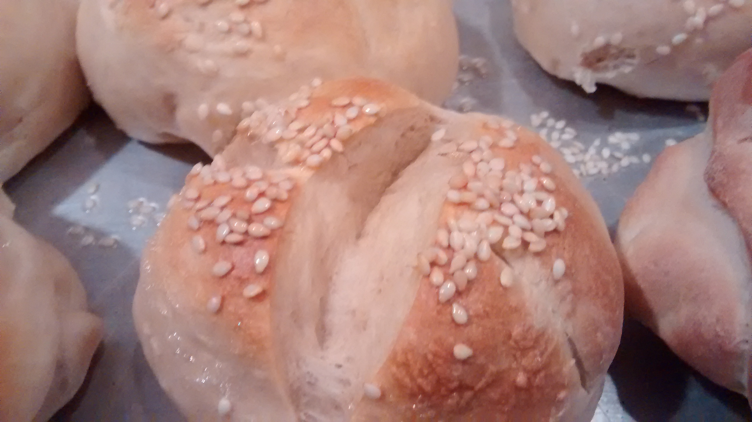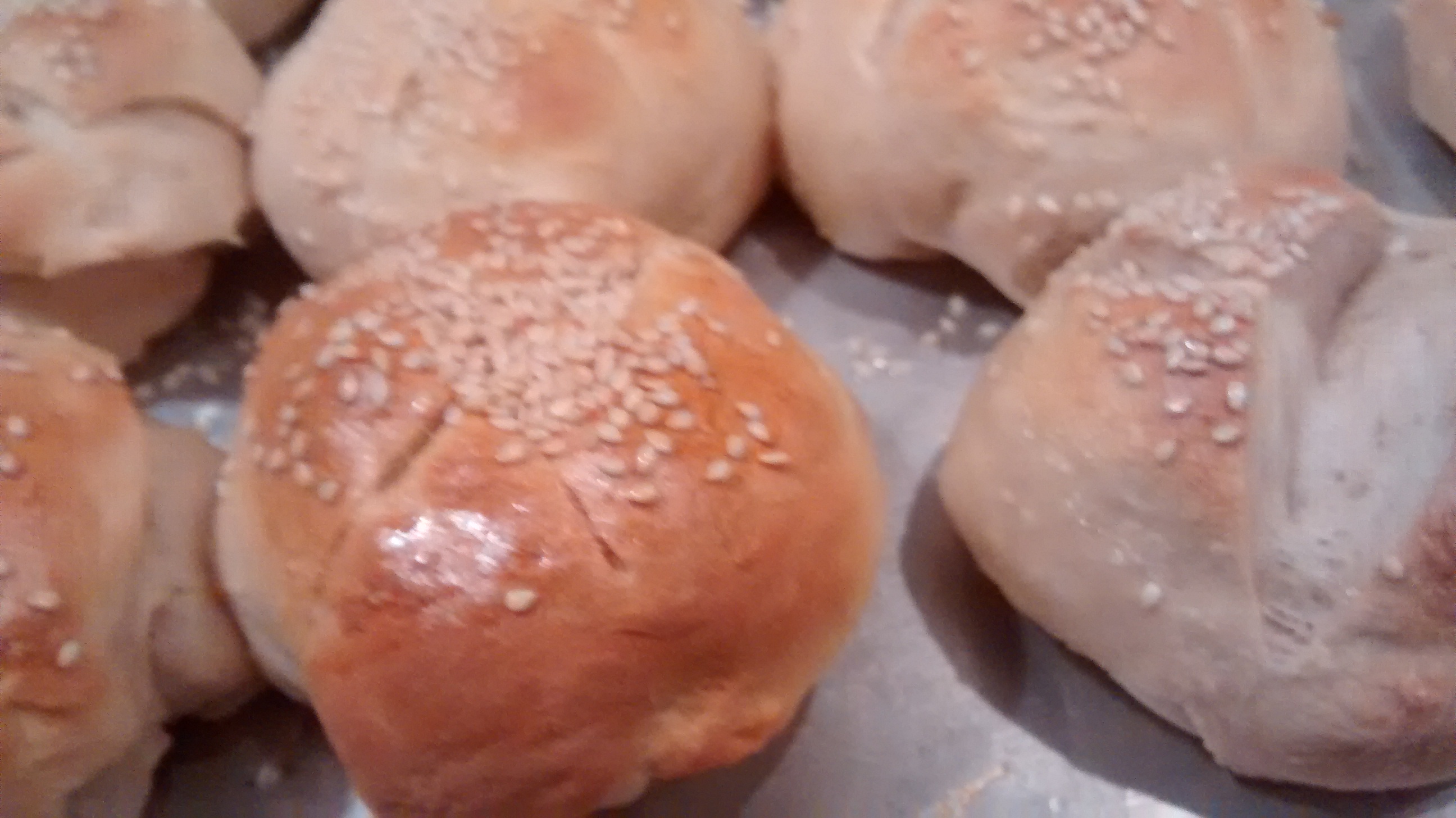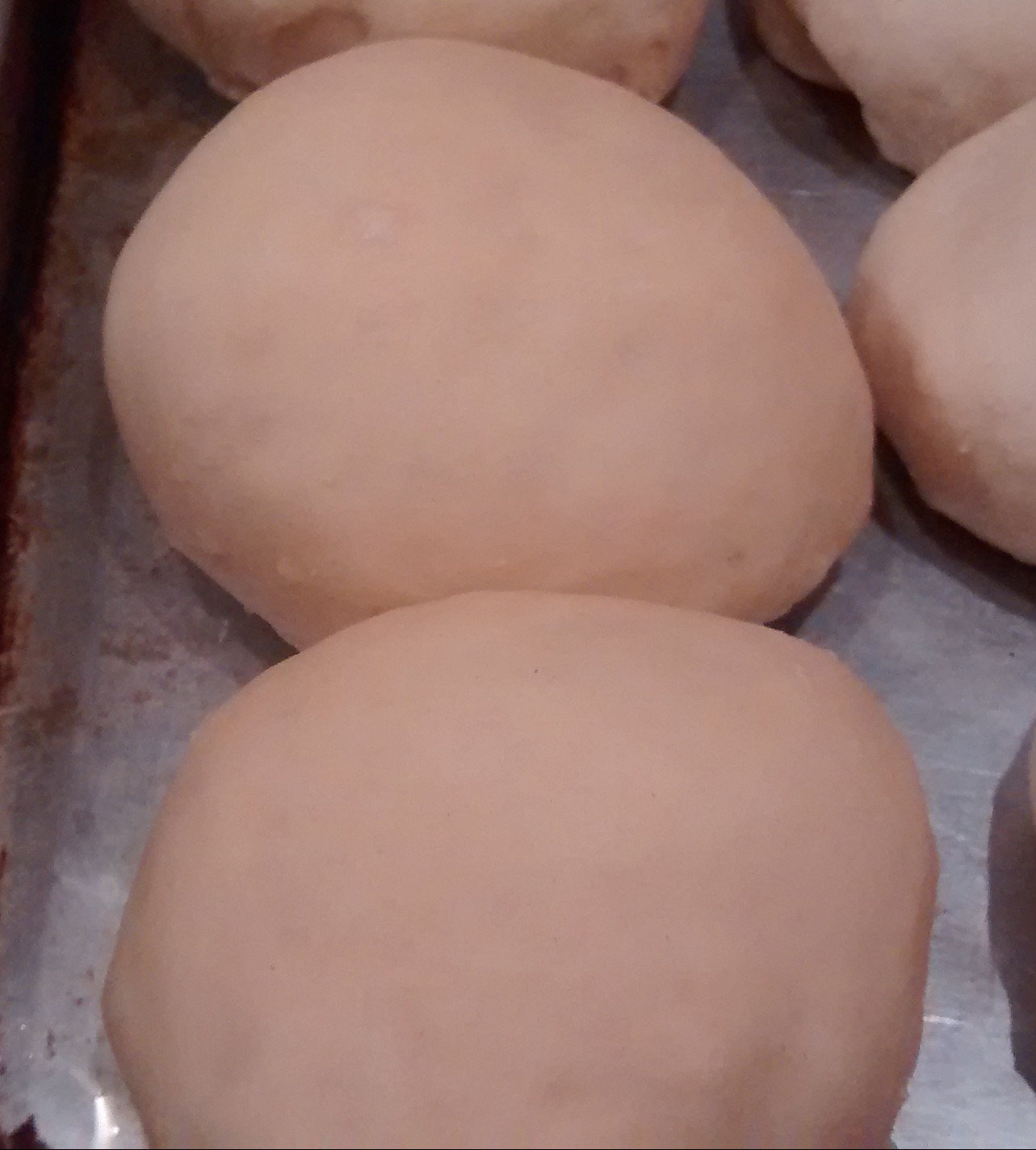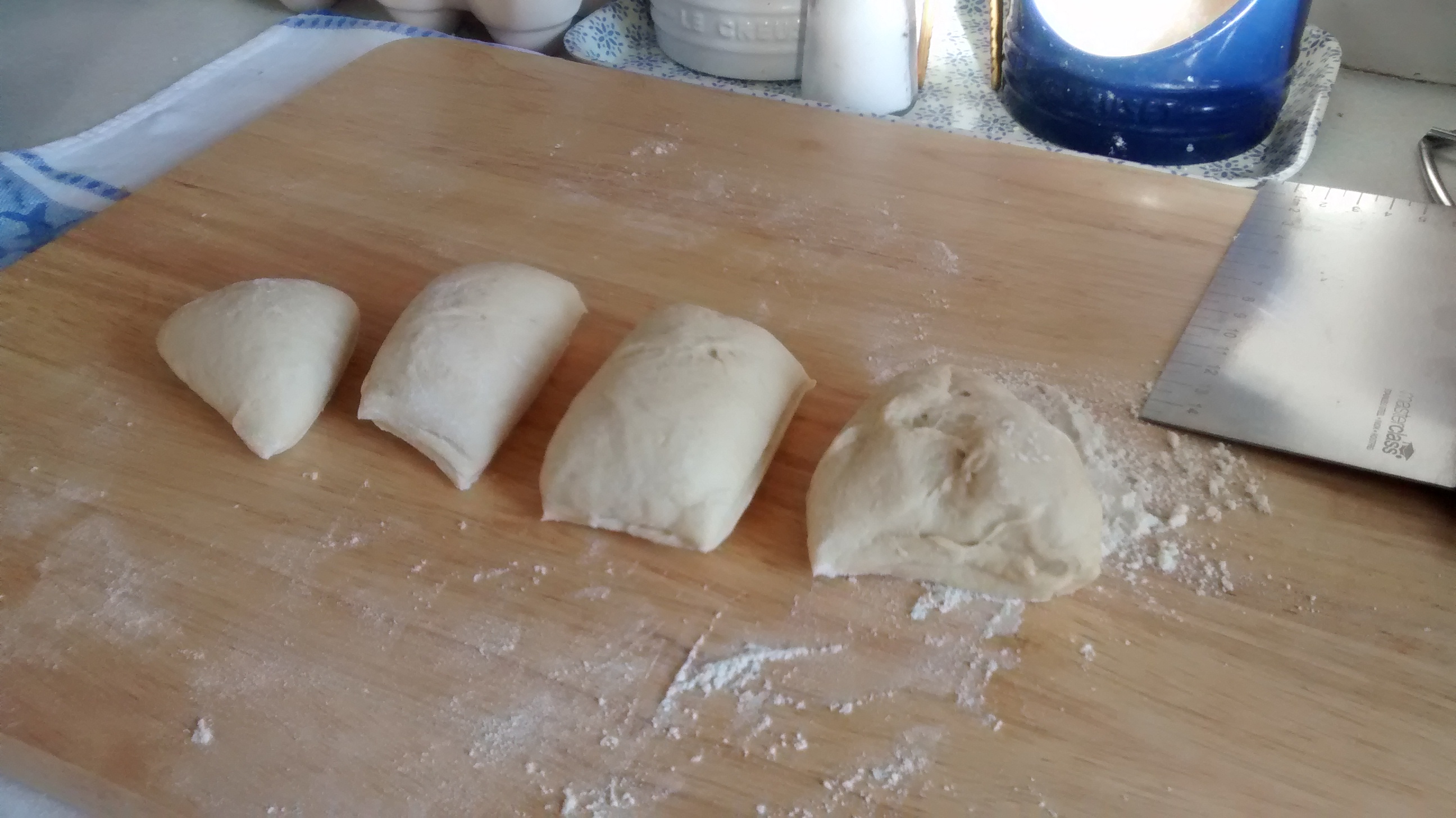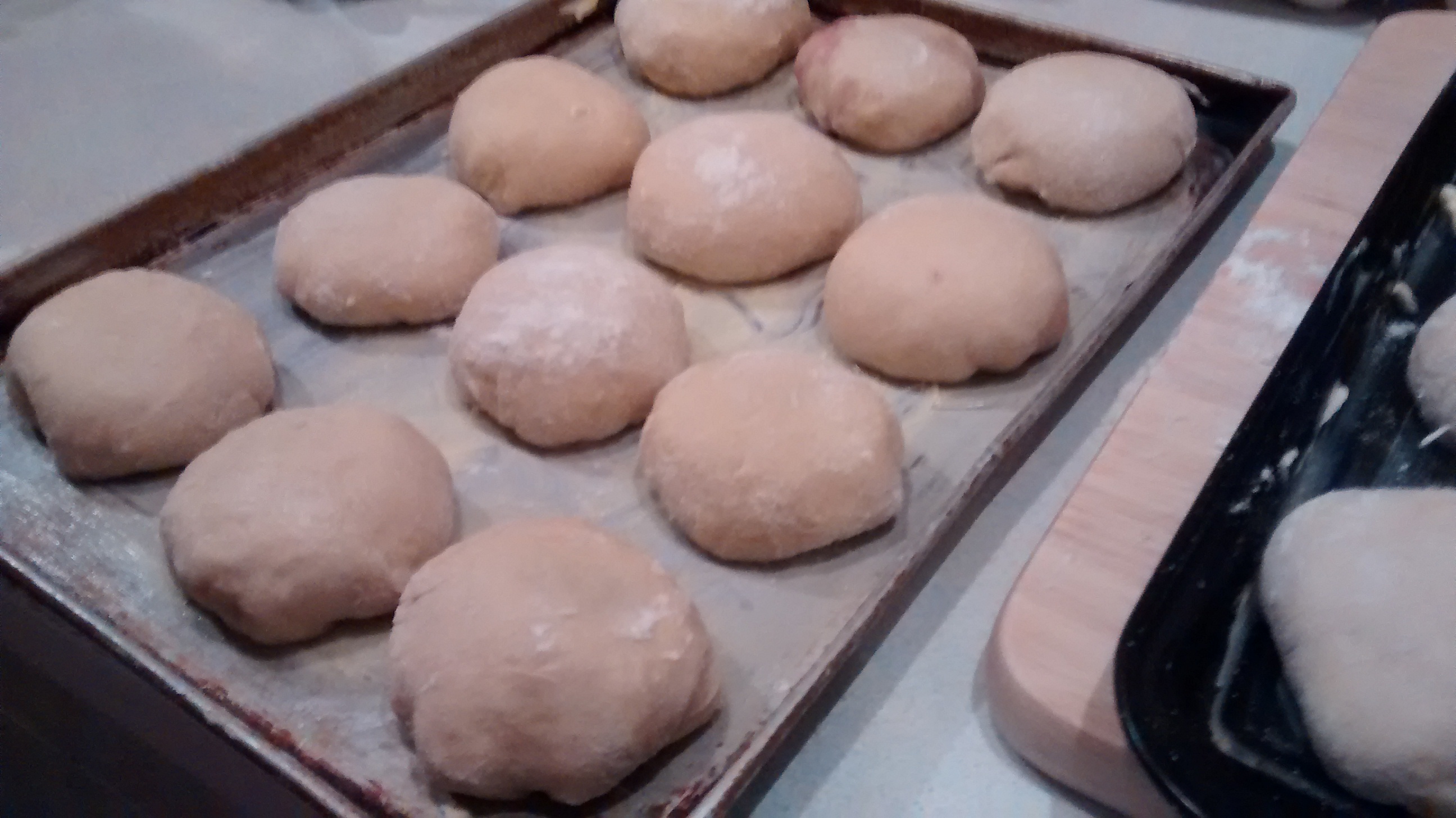 Divide the dough into 2, then each half divide into 2 again. Then divide each piece into 3 equal pieces so giving you 12 pieces. Roll each piece of dough in your hands to make a smooth round ball. Place these on the greased baking sheet with space between them for them to rise. Cover loosely with a cloth and leave them to rise.