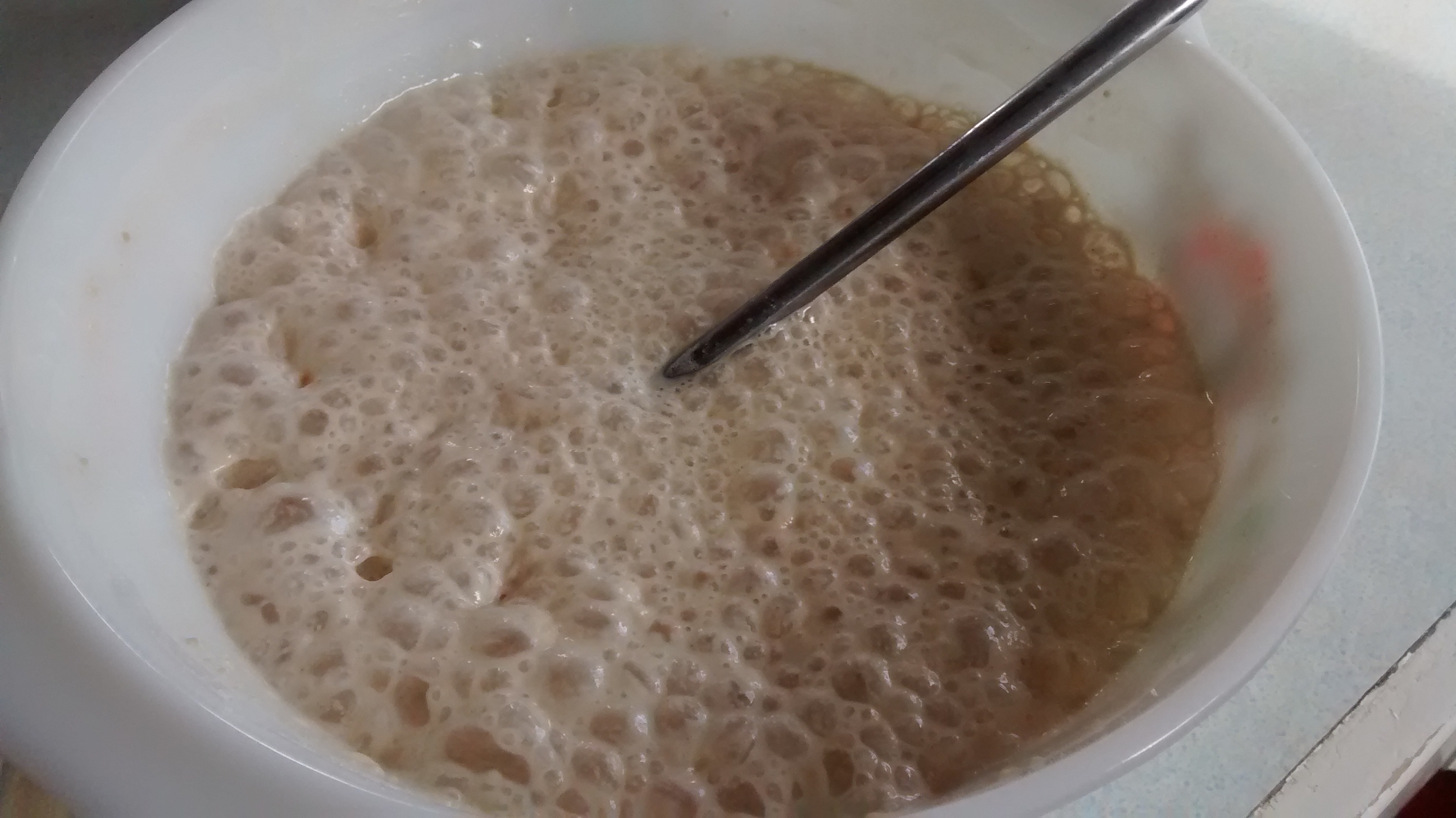 Put the 100g of flour into a bowl and add the milk and yeast mixture, mix it all in to form a batter.
