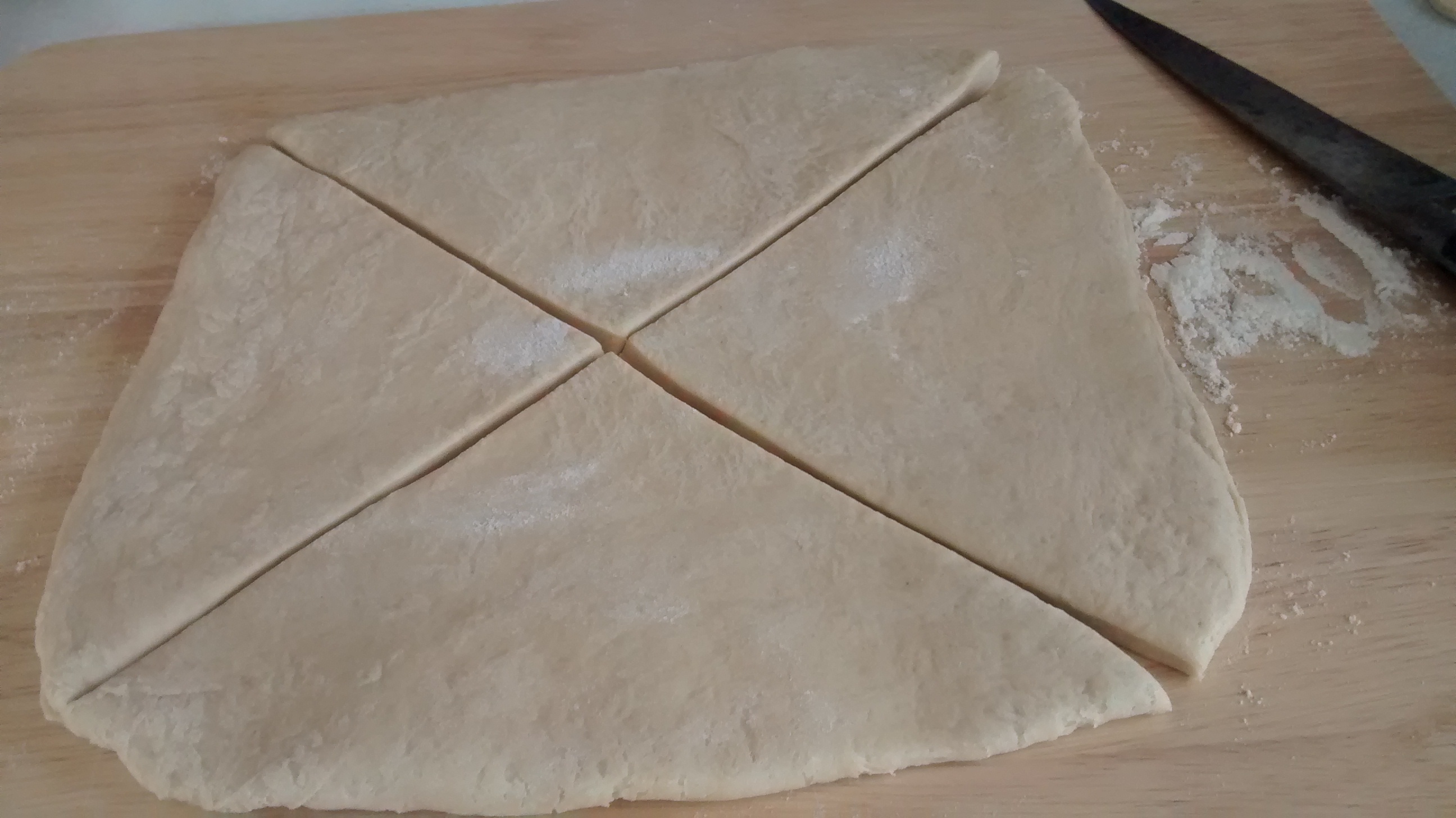 Take the dough and divide it into 2, take each piece separately and roll it out into a rectangle, as thinly as possible, and cut this diagonally across to make 4 triangles.