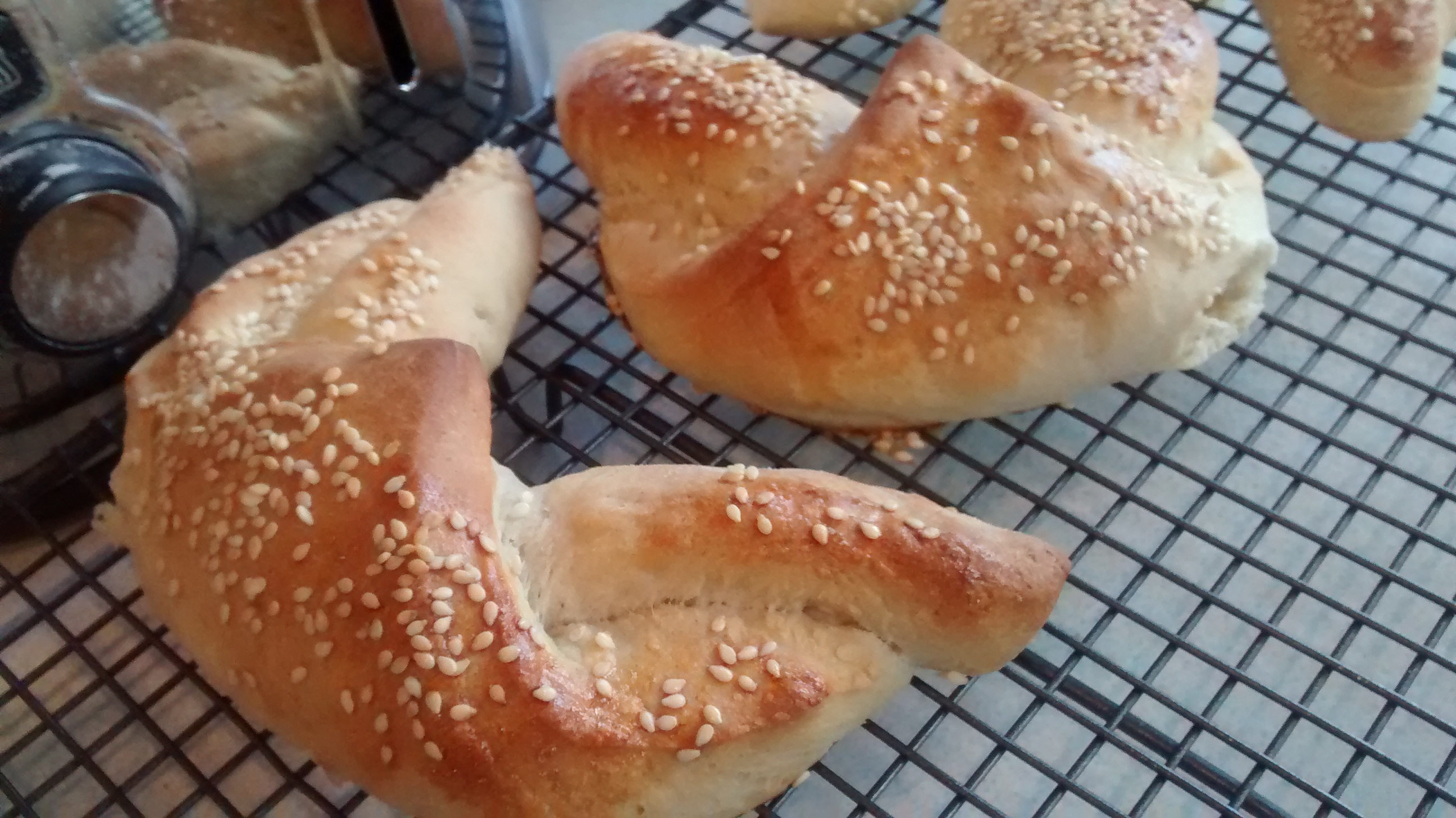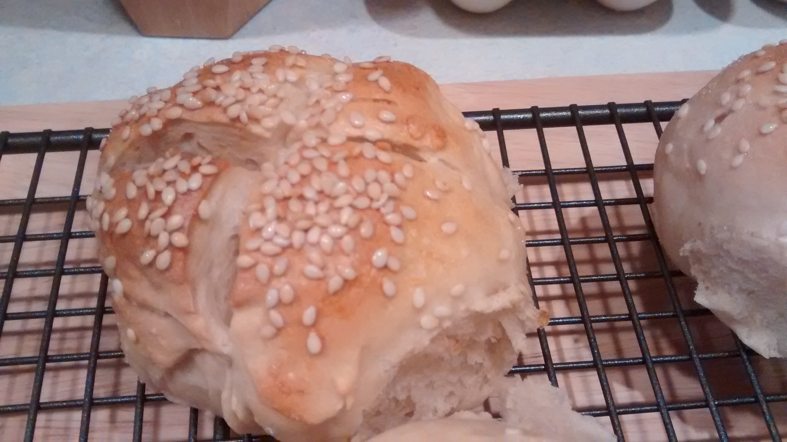 These are Kaiser rolls and originated in Austria – they are meant to look like a crown for the Kaiser. Cut a cross on the top of the dough using a sharp knife – this expands as the dough rises – or you can make 3 cuts to make a 6 pointed star. However the traditions Kaiser roll does in fact have a 5 point cut at the top.