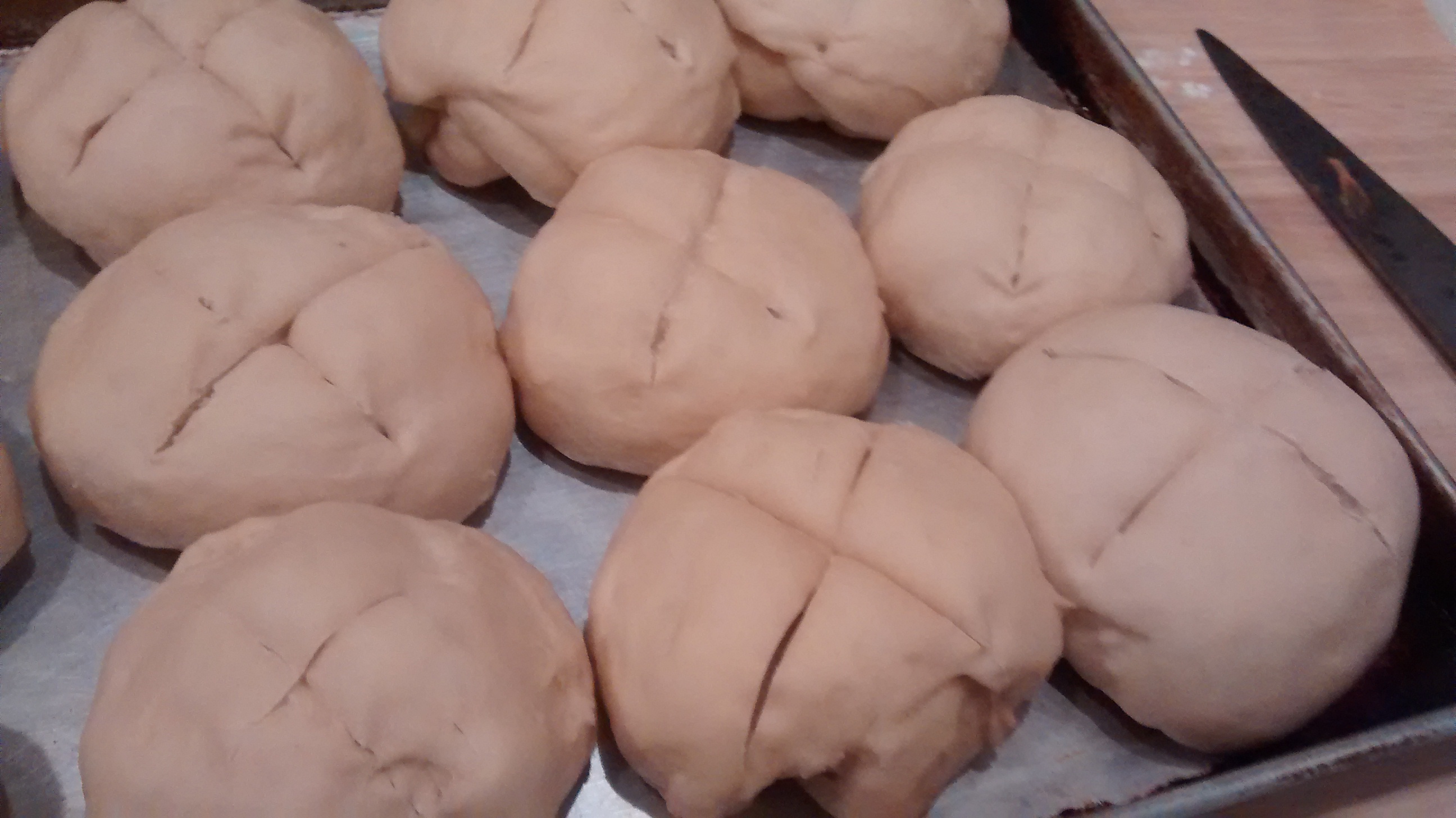 Cut a cross in the top of each bun – cover them with a cloth and leave them to rise.