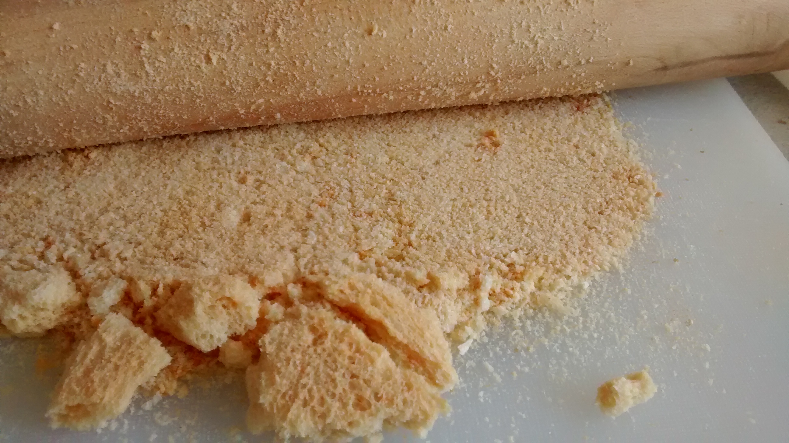 Put the dried bread on a chopping board and use a rolling pin to crush it.