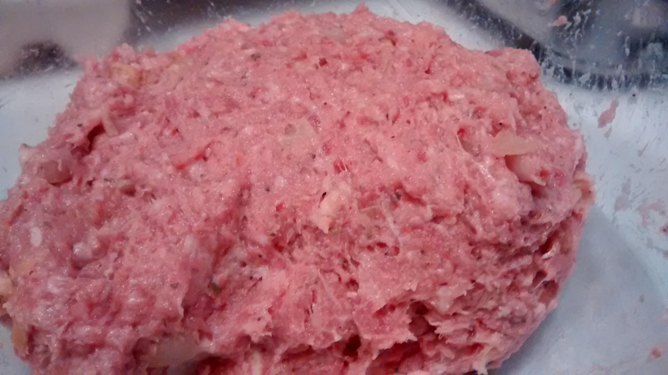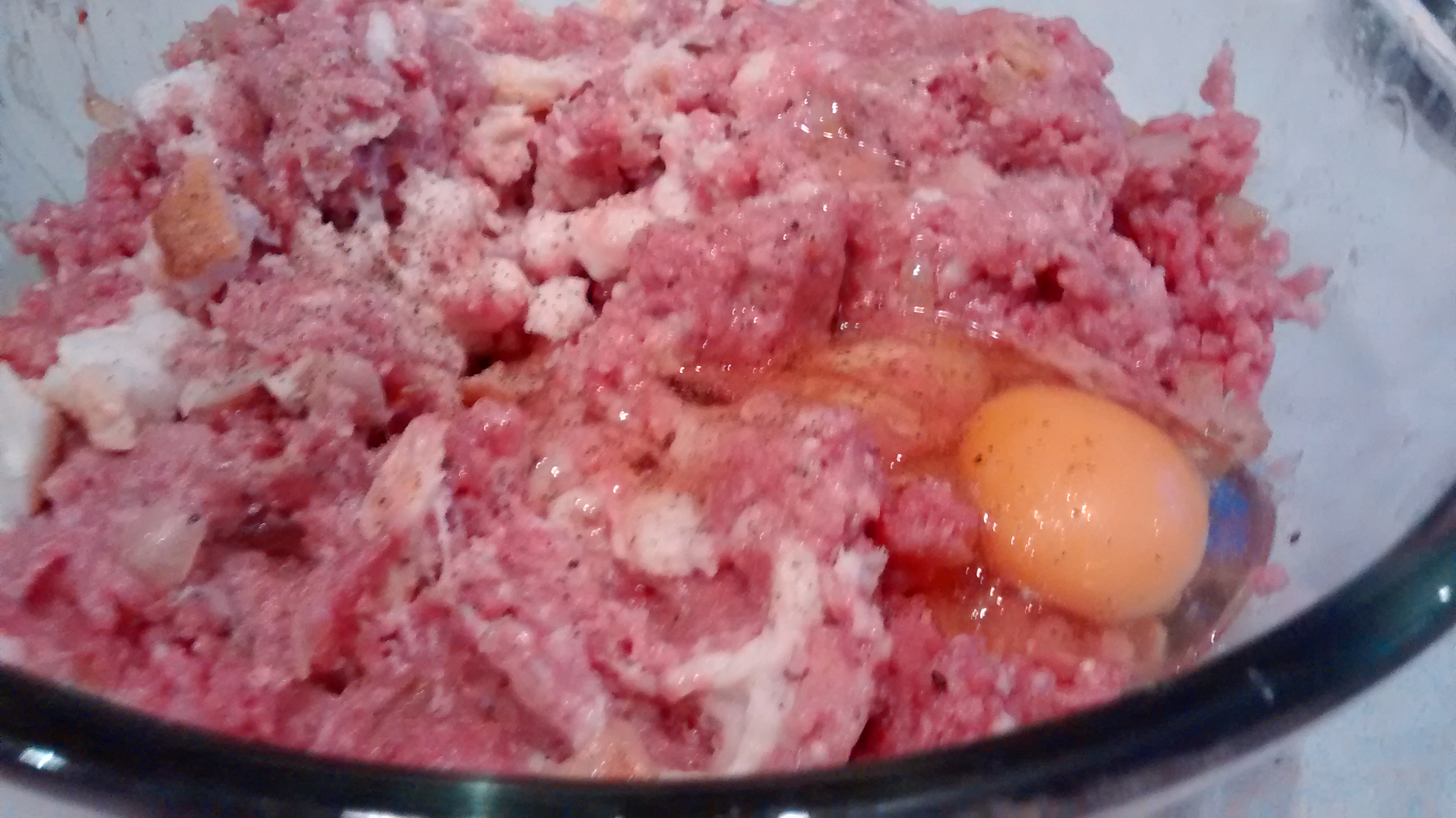 The meatloaf would have been made in Poland with minced pork but often in England my mother used minced beef as it was more available. To this was added grated onion, bread moistened with milk, a beaten egg, salt & pepper; this was shaped into an oval shape and covered with dried breadcrumbs and baked in the oven.