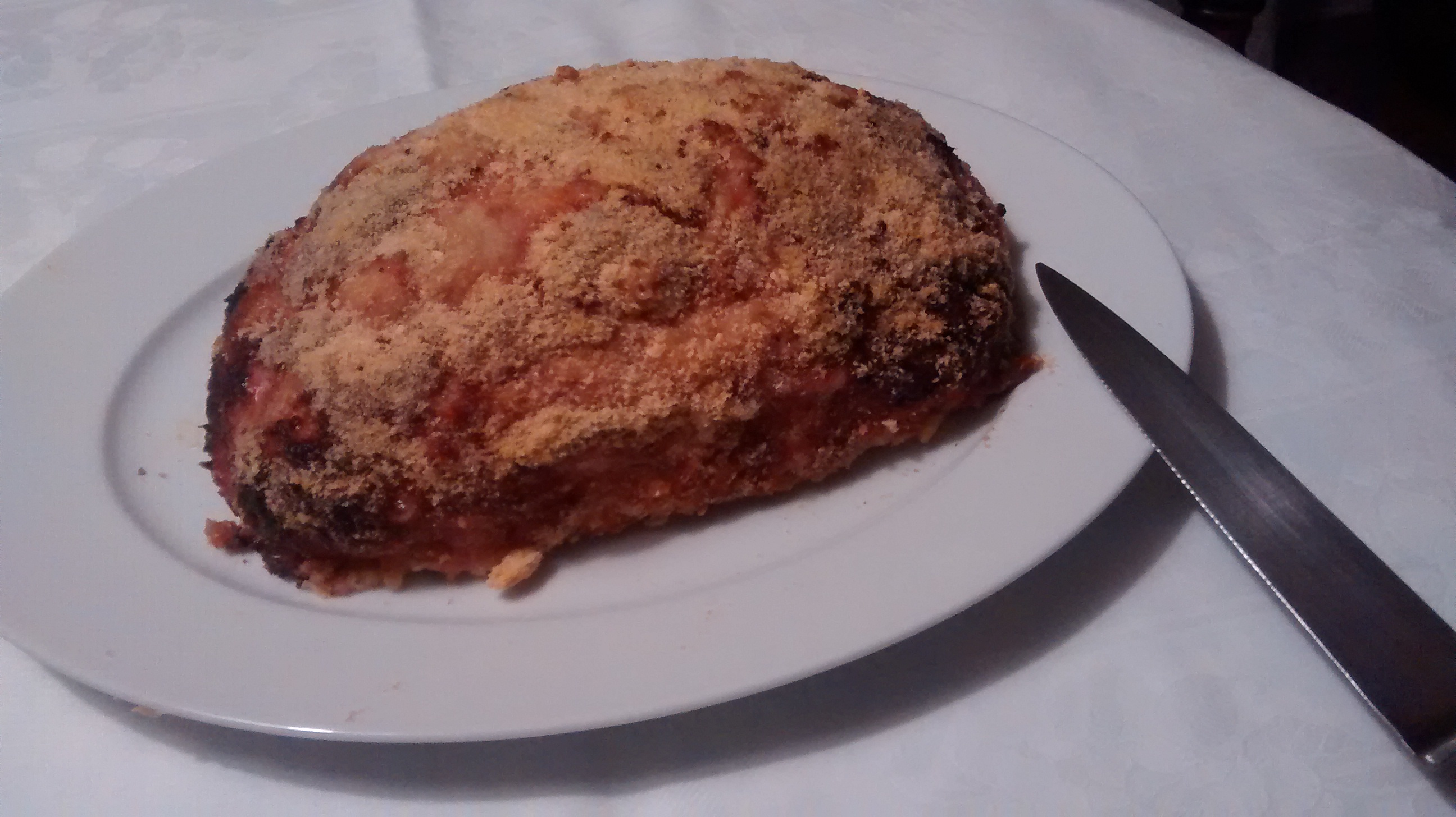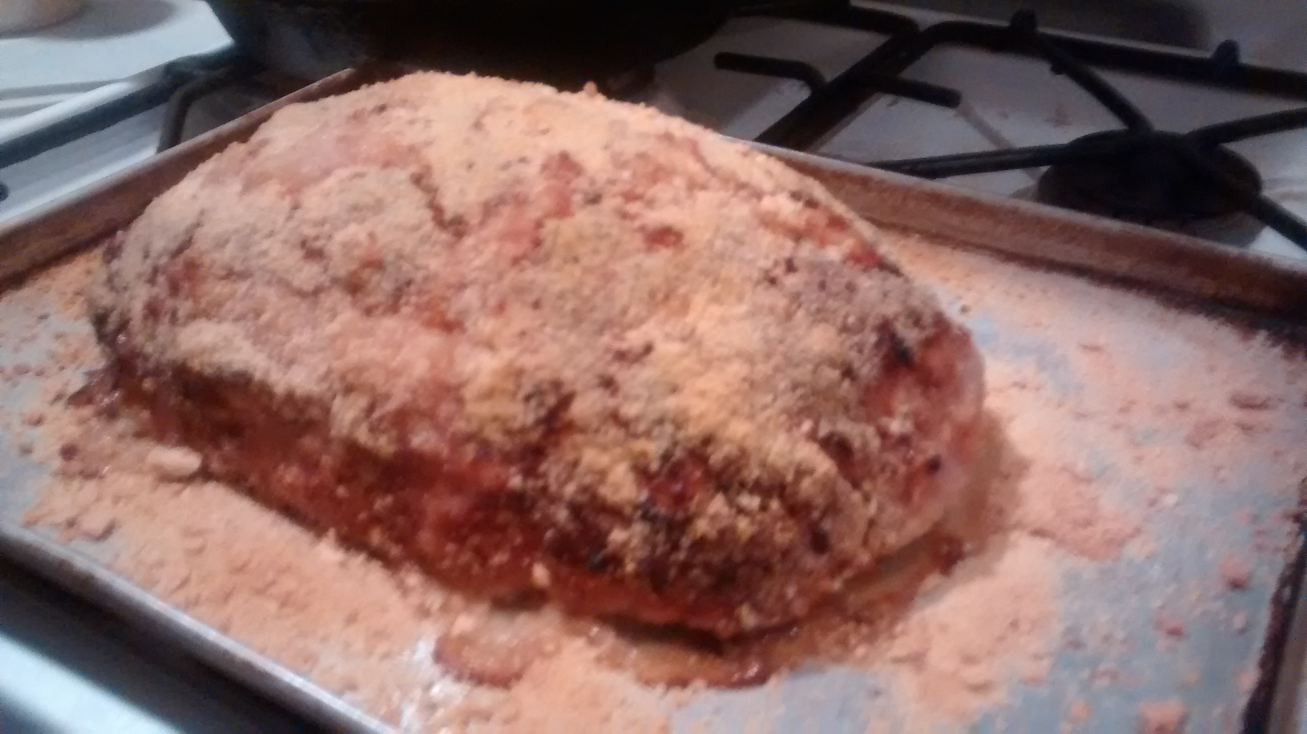 Cover the loaf with lots of dried breadcrumbs and place into the oven. It will take about 1hour 30minutes maybe longer – it needs to be done to a golden to very golden colour and the breadcrumbs will be crispy.
