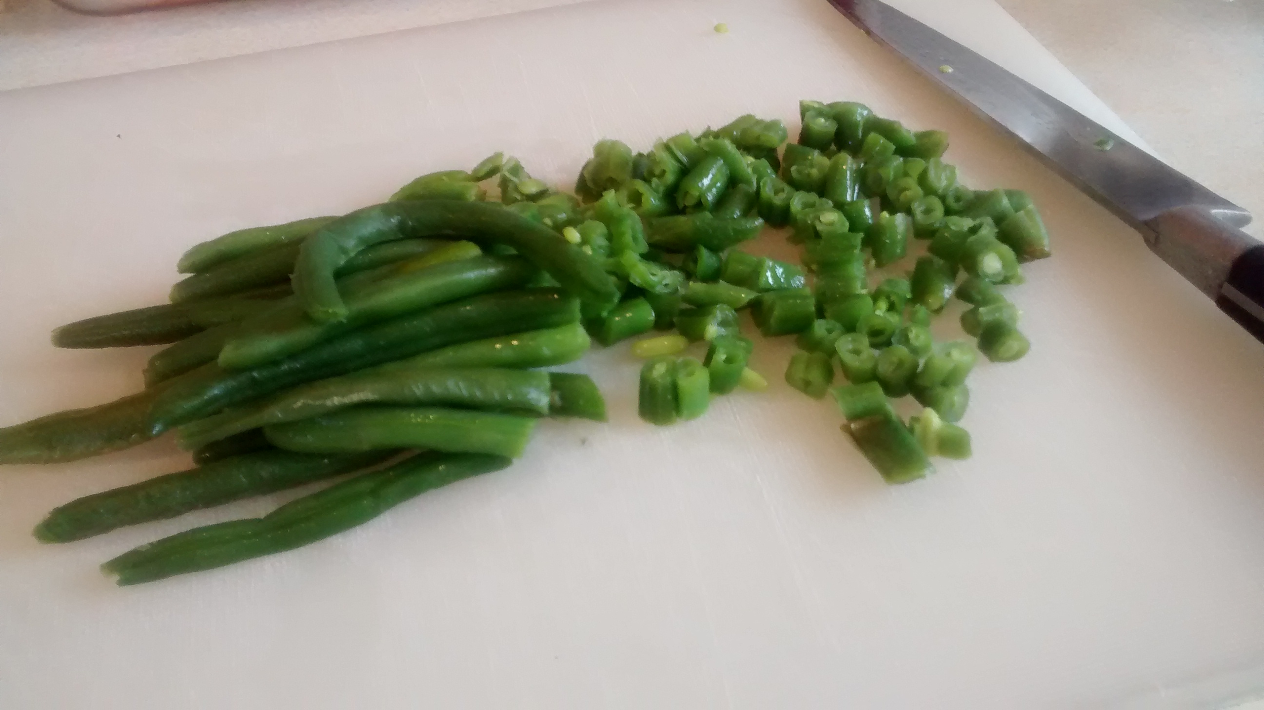 • Chop the green beans  into small pieces similar in size to the peas.