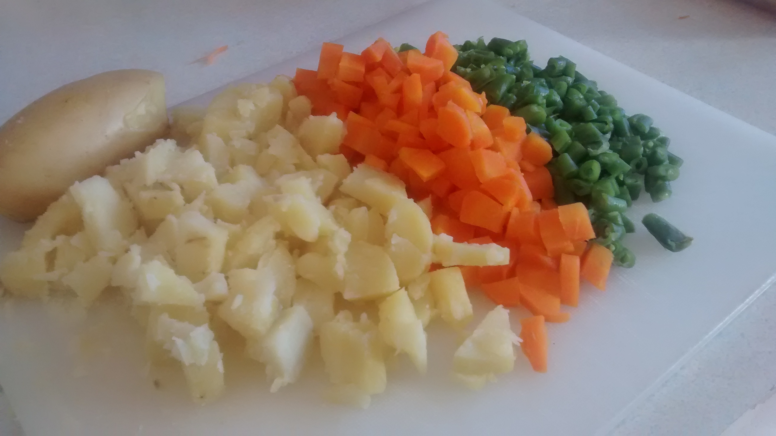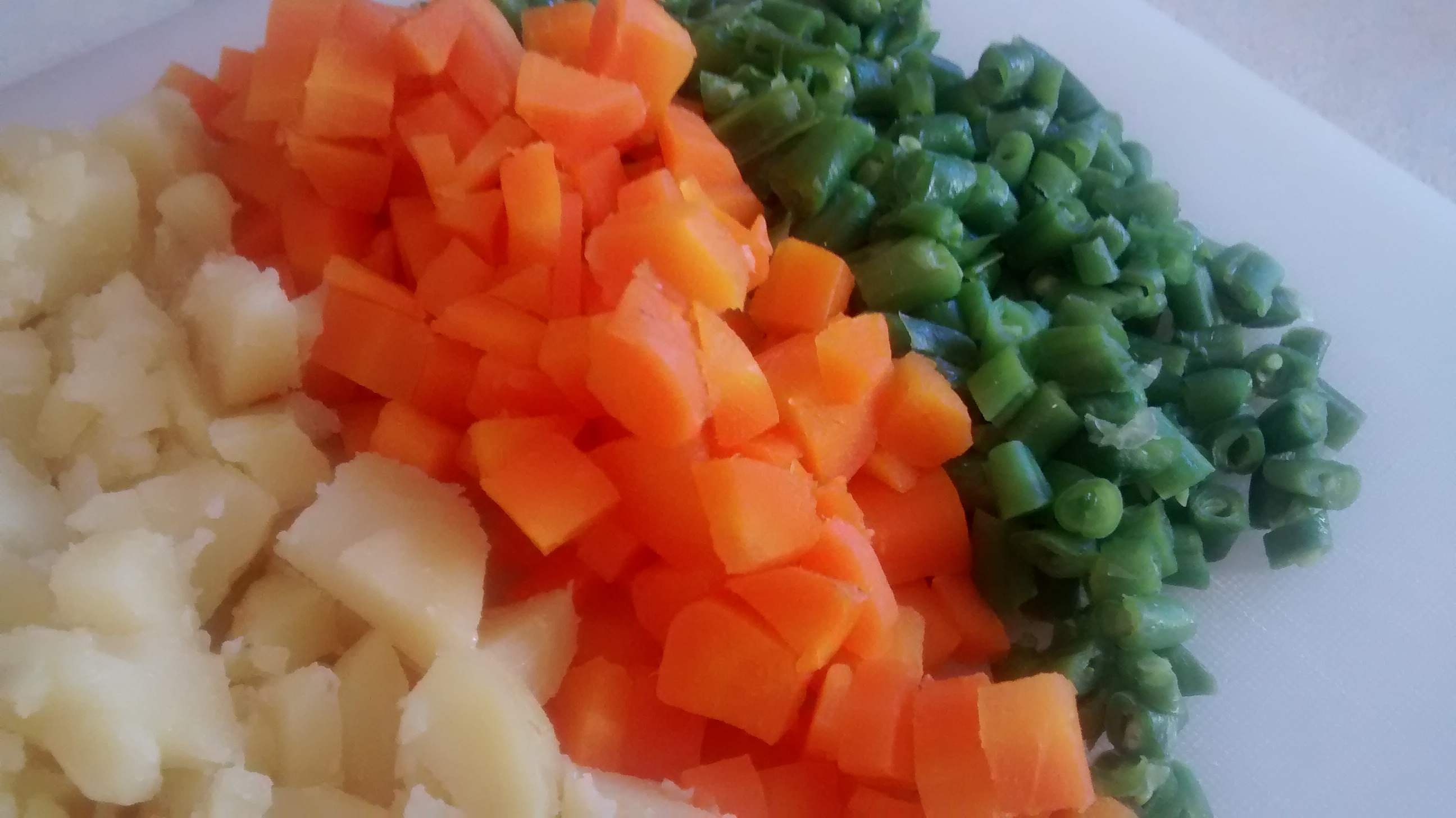 The following salad was made from potatoes, carrots and whole green beans which were cooked before assembling.