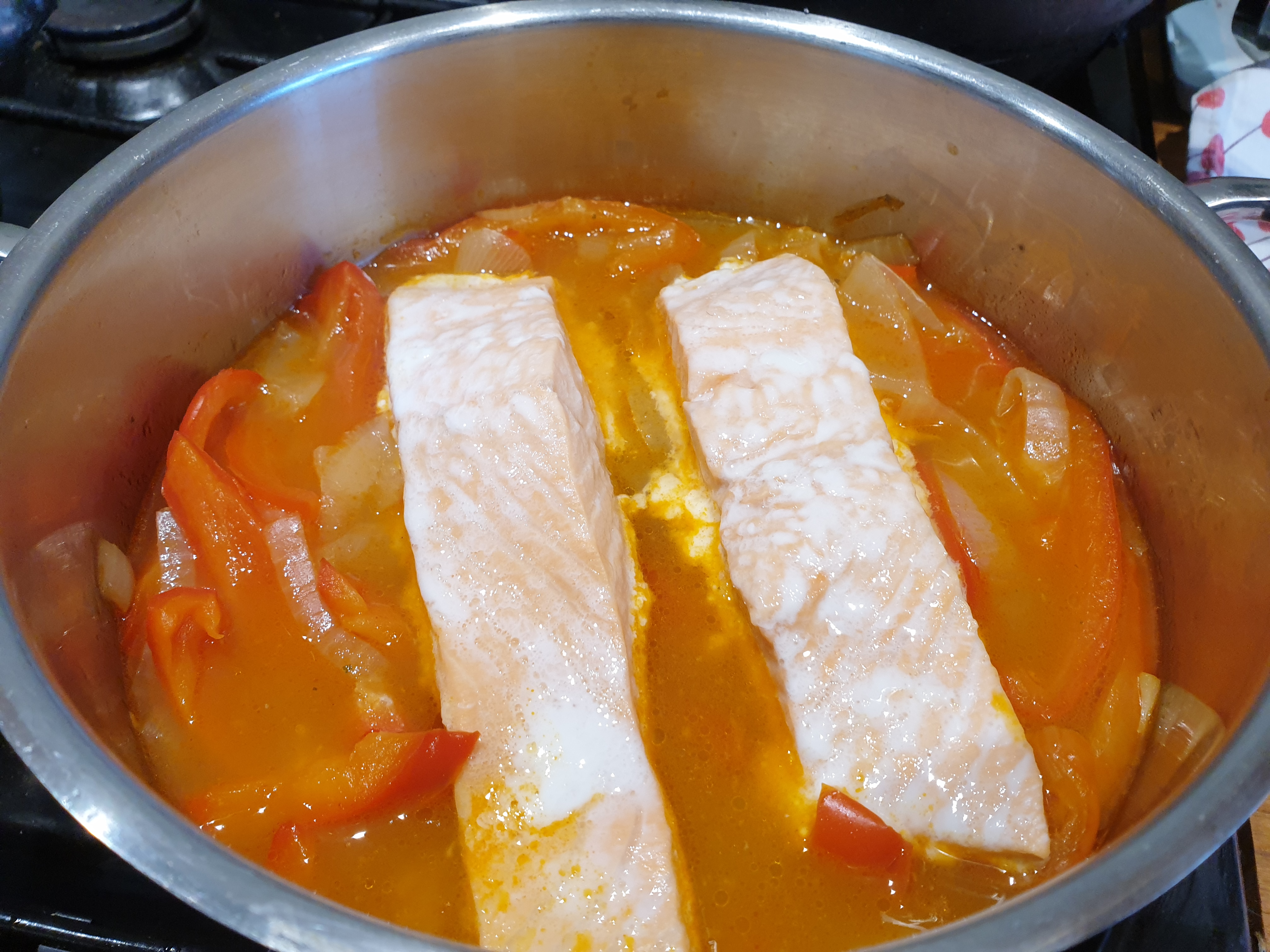 - Add the rest of the vegetable stock to the baking tin and the paprika and tomato purée or ketchup and stir.