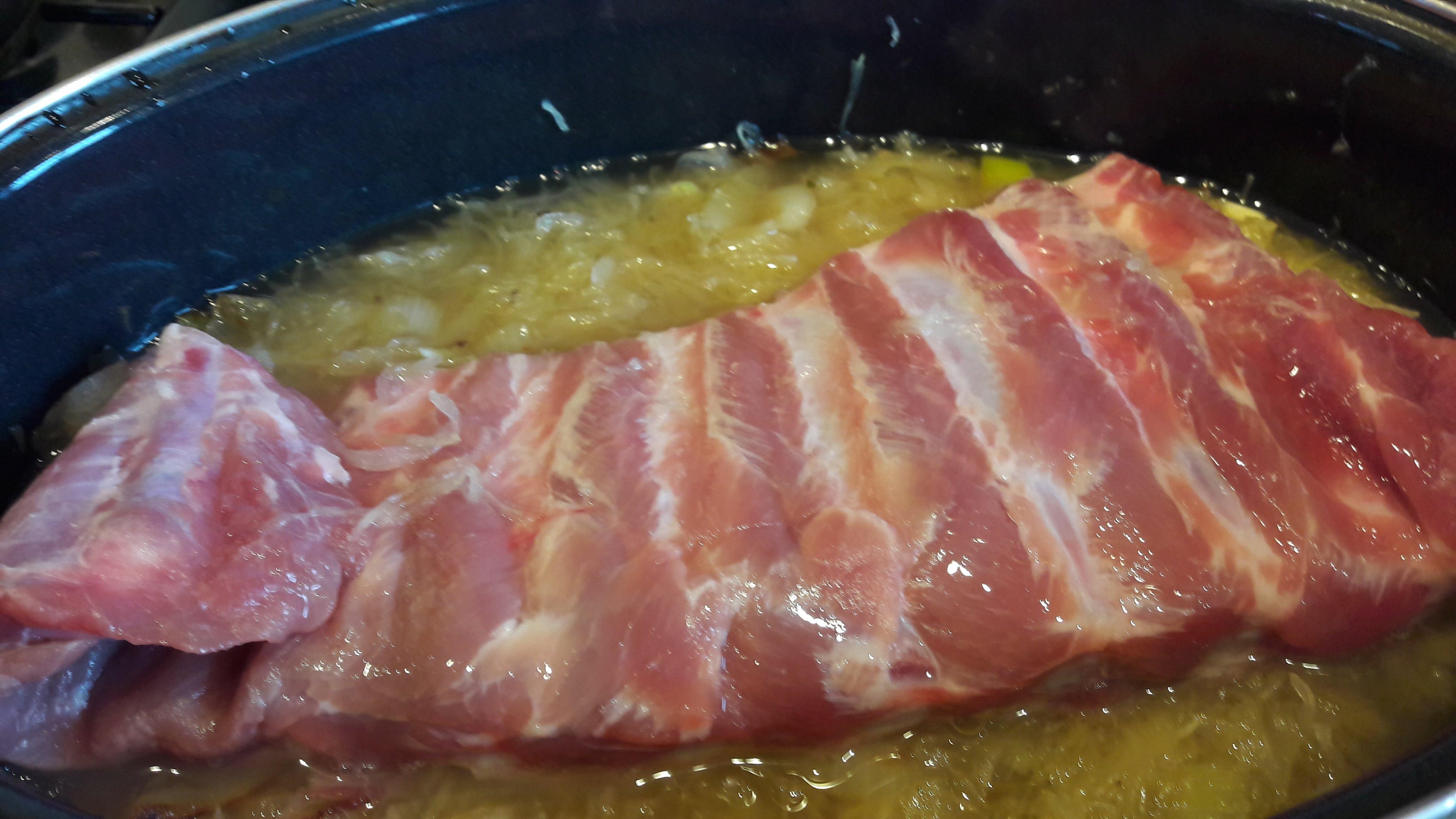Place the ribs on top of the sauerkraut and pour the rest of the stock over them.