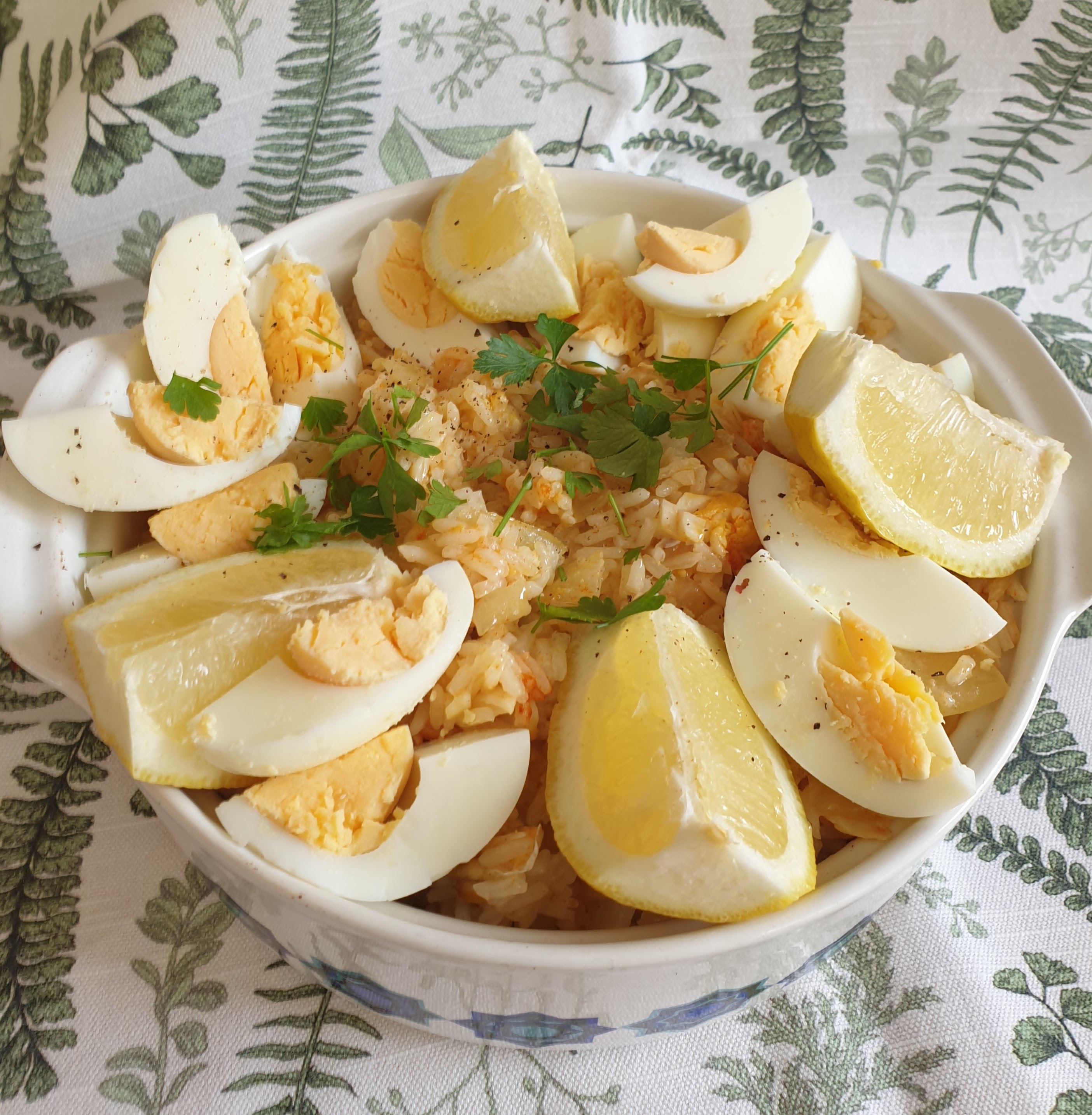Serve in a large dish with hard boiled eggs and lemons around the side.